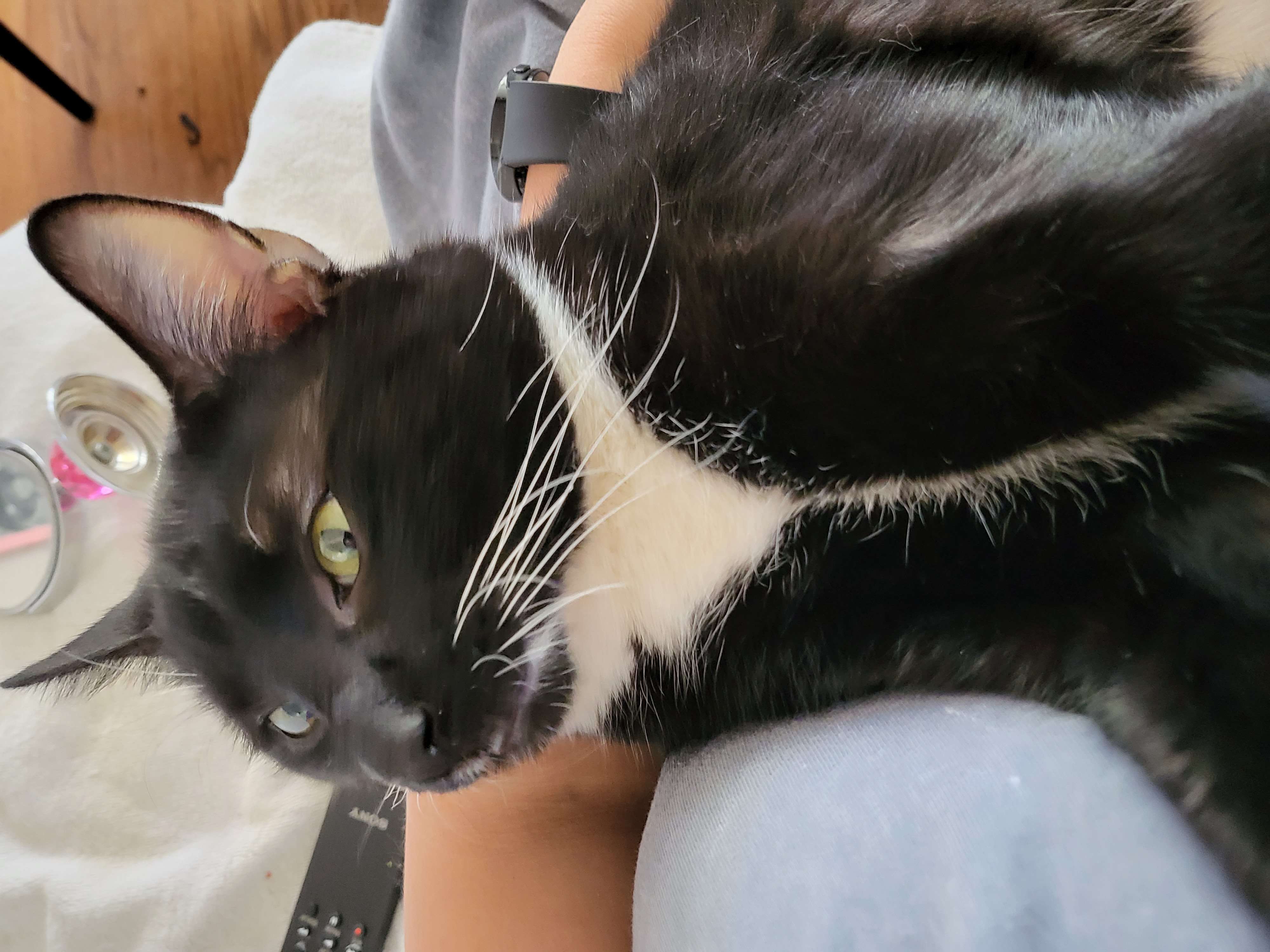 Black and white tuxedo with a bent tail.
