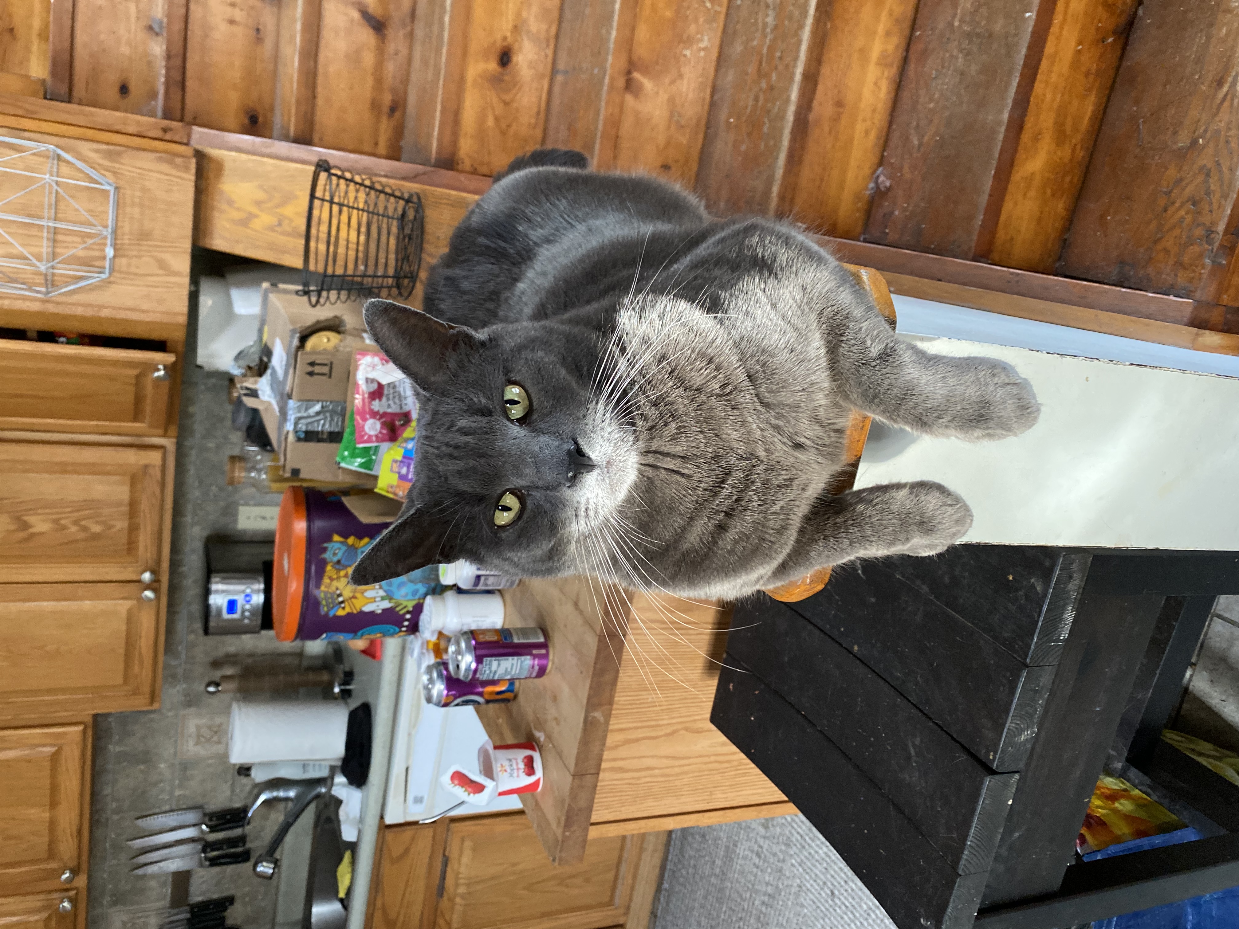 Gray cat with no tail. Super friendly and loves a good cuddle. Never been outdoors, so is likely seeking shelter somewhere warm.