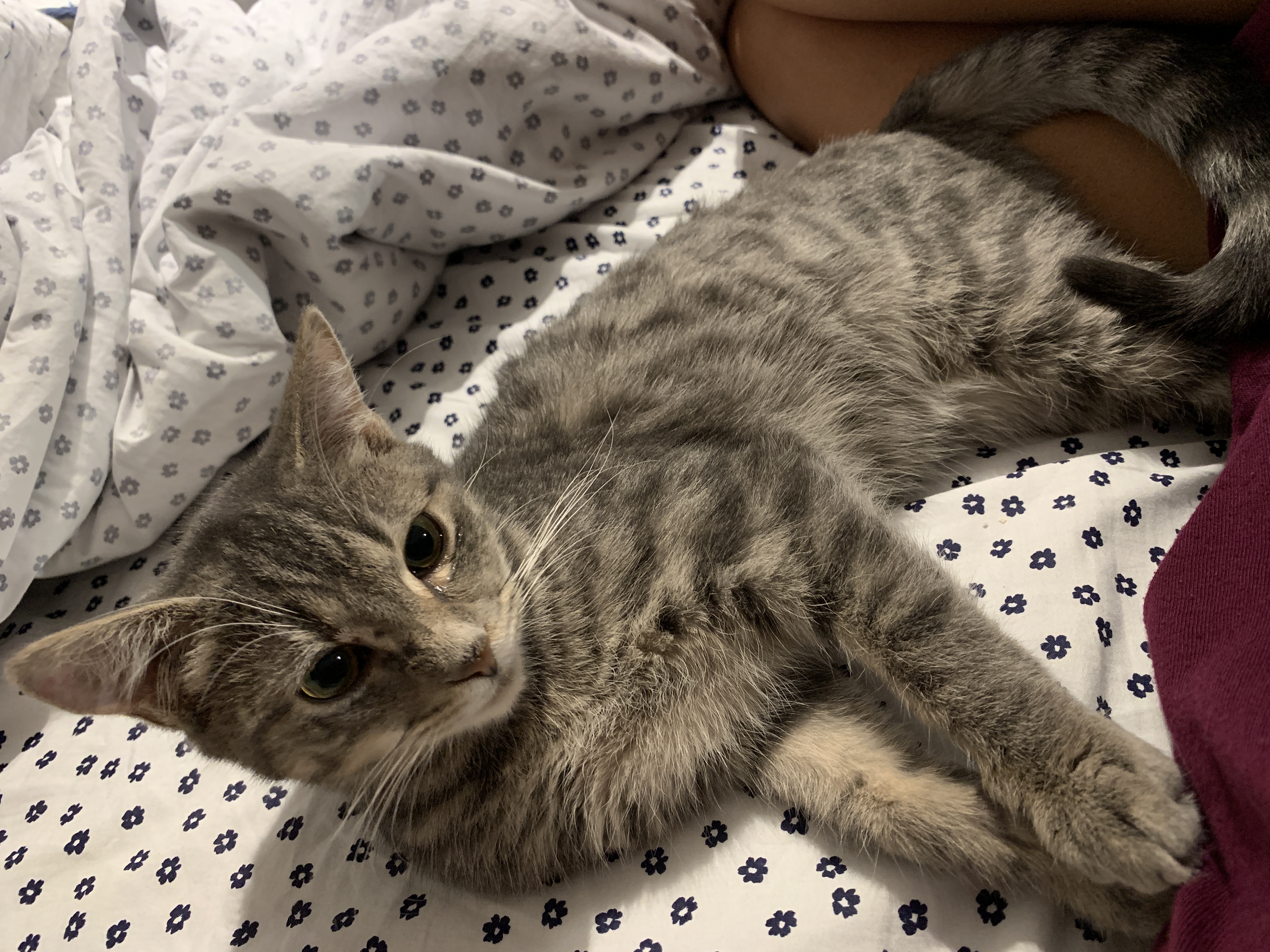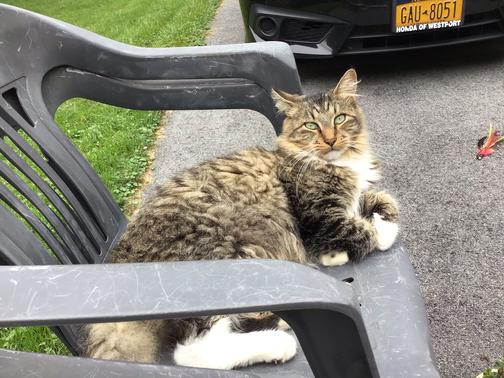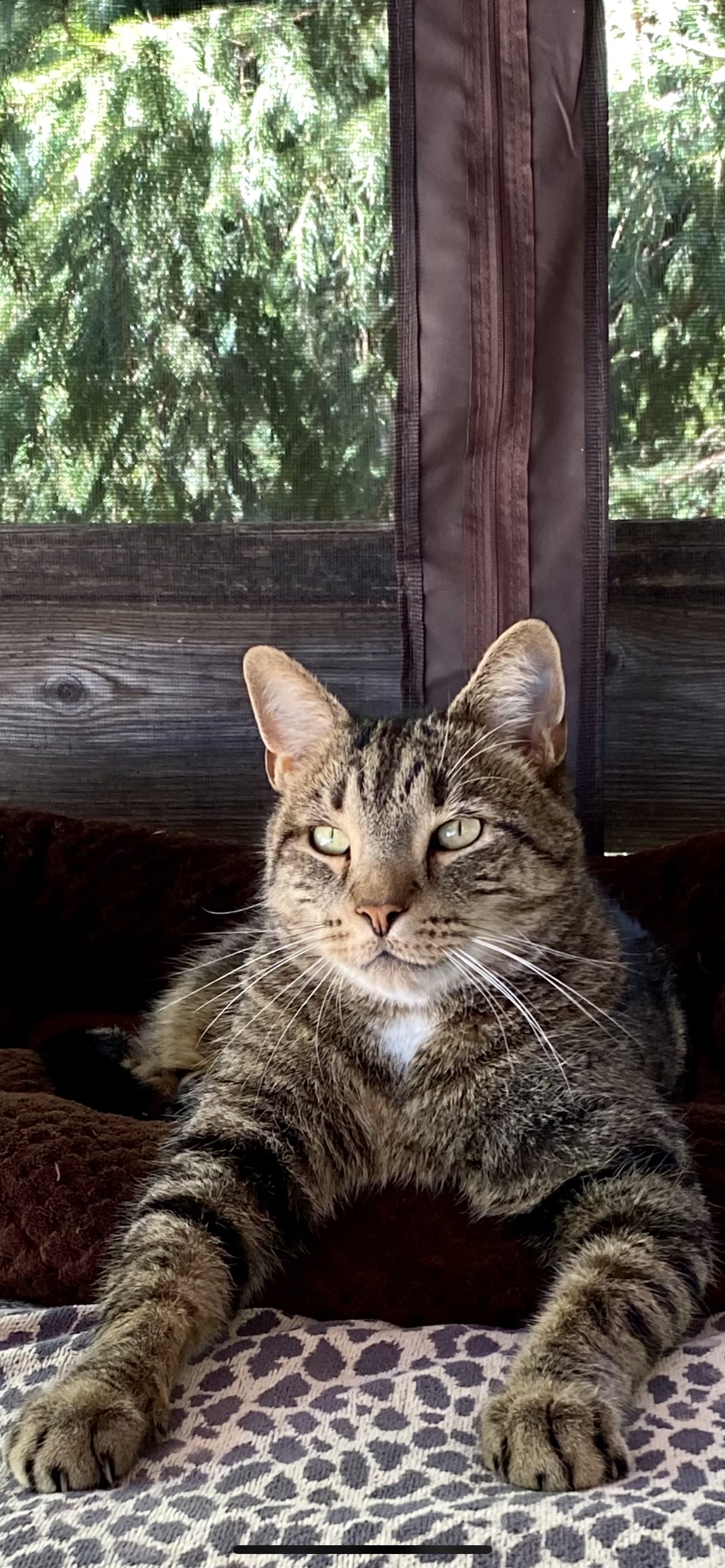 This poor guy started showing up on our porch in August, we are feeding him, he was dumped he comes to you, purrs and talks. On the skinny side, we took out indoor cats bed and placed it up and put him inside so he knows he can stay out of the elements. We have