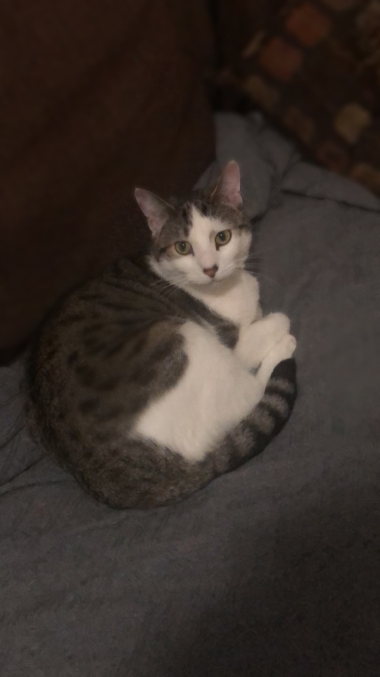 Very friendly indoor cat, gray and white, flea/tick collar. We live on the border of Tivoli and Clermont off of Lasher Rd.
