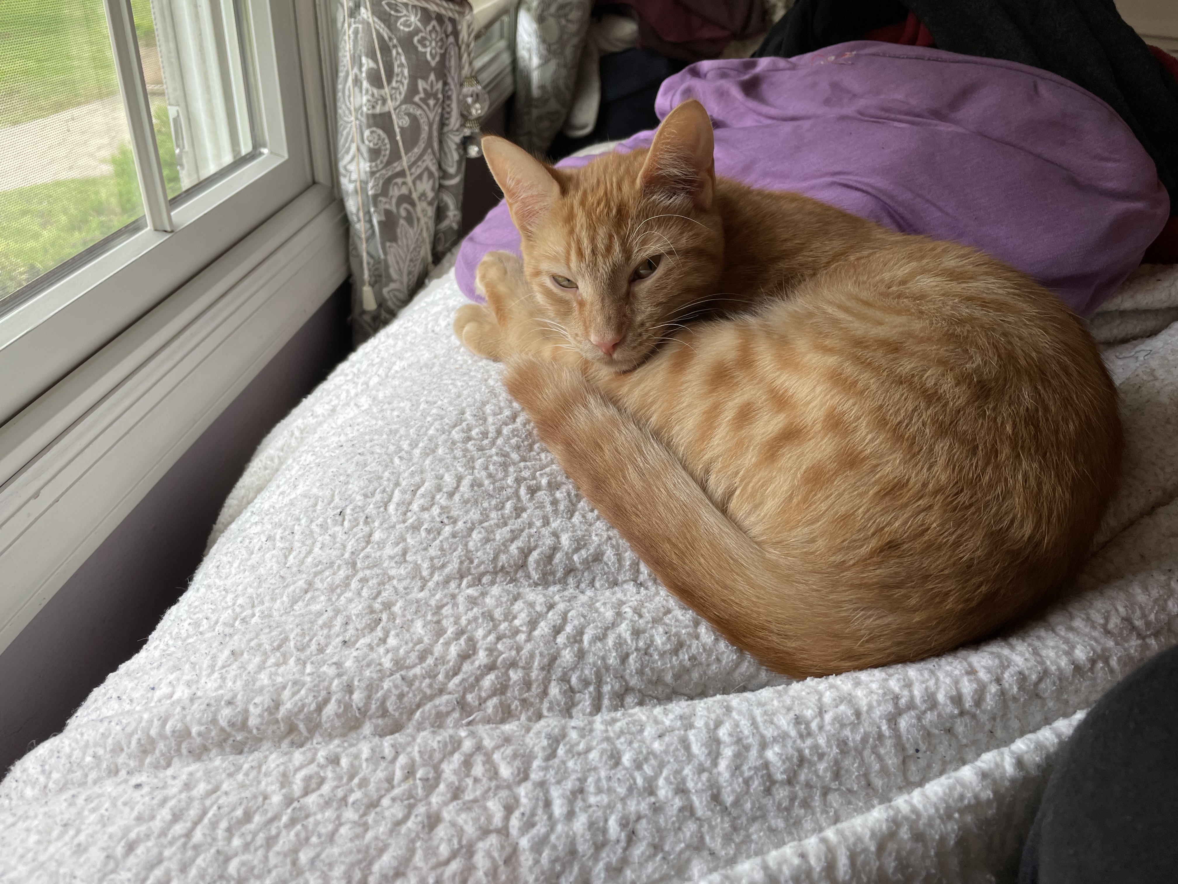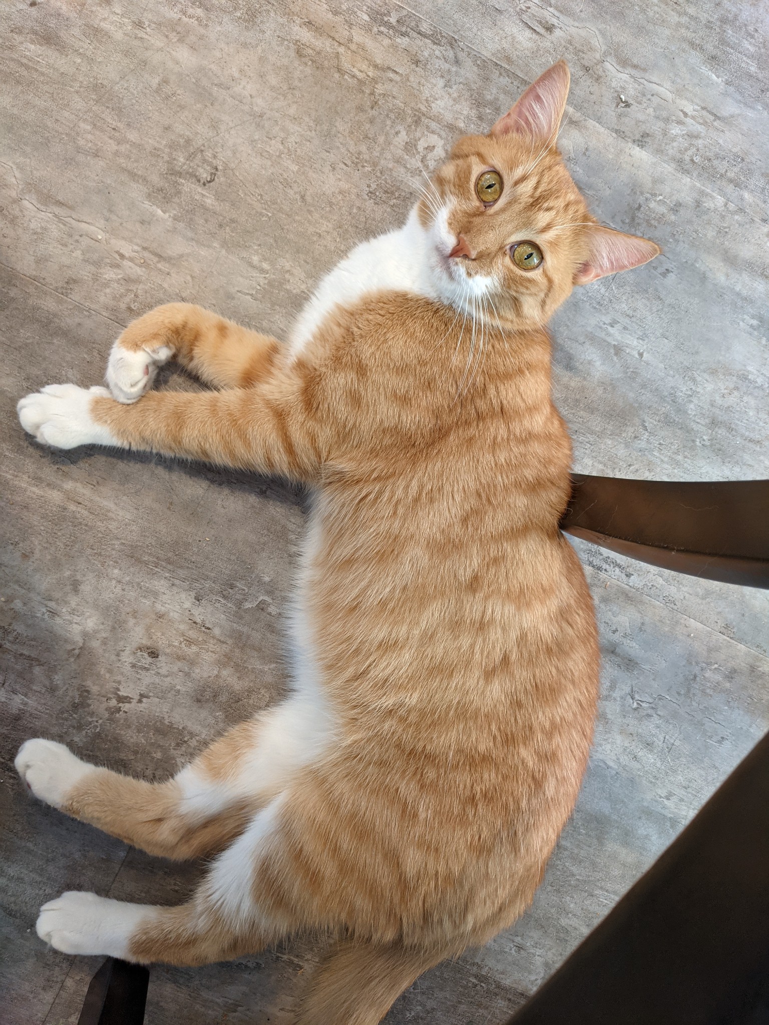 Our five year old male orange and white cat, Caramel, is microchipped. He's wearing a calm collar. We adopted him about 6 weeks ago. He is usually very friendly towards people but gets easily frightened of loud noises and dogs.
