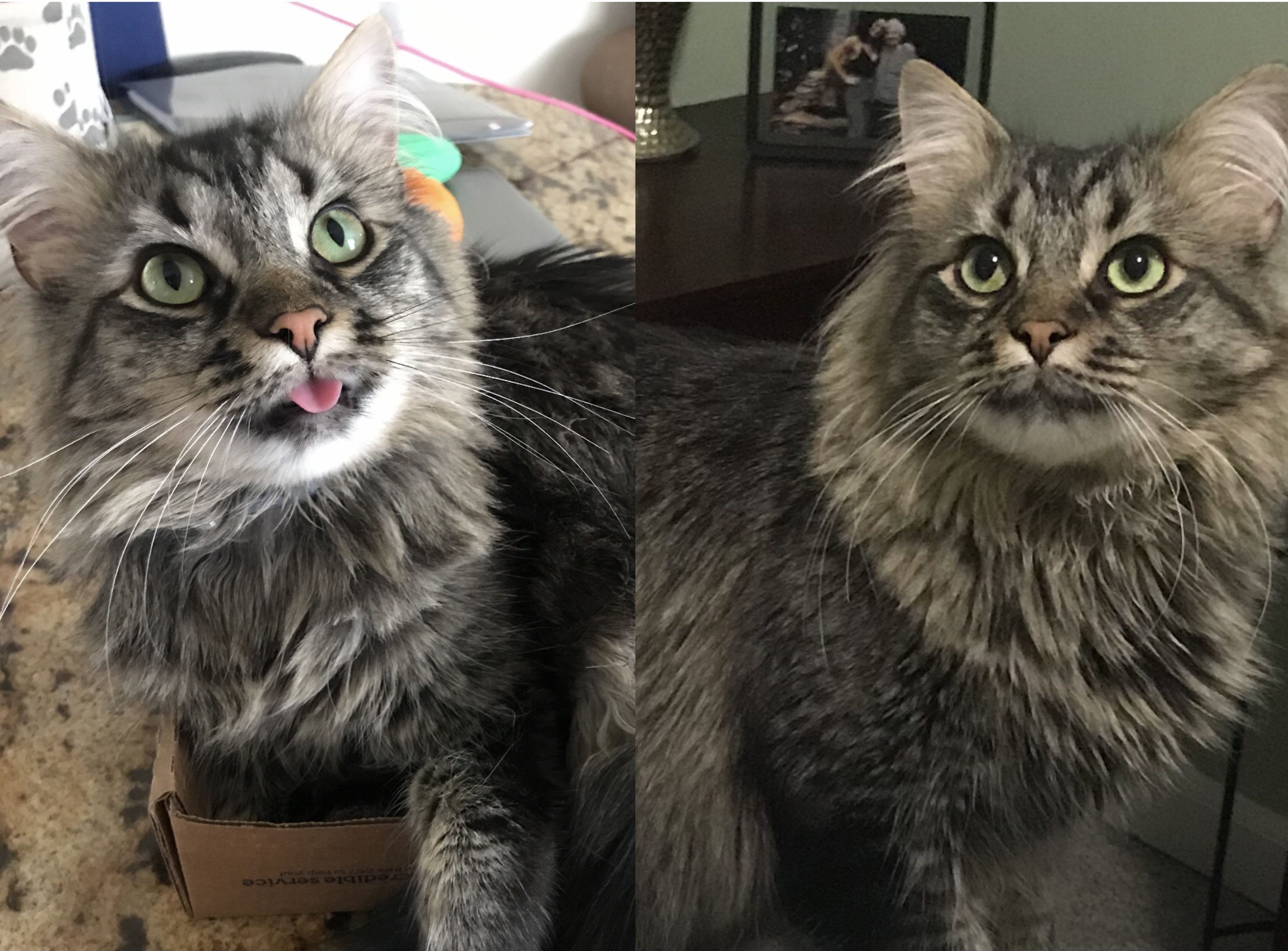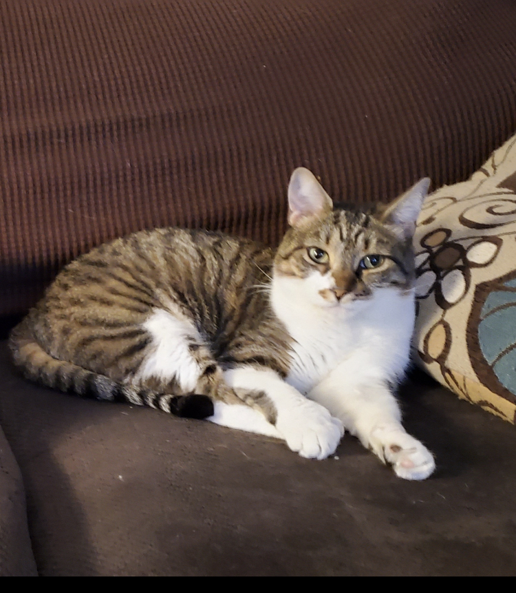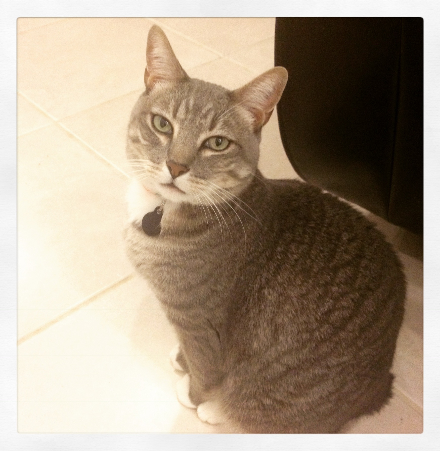 Goose is a grey tabby with a white underside. He does not have a tail. He is very sweet.