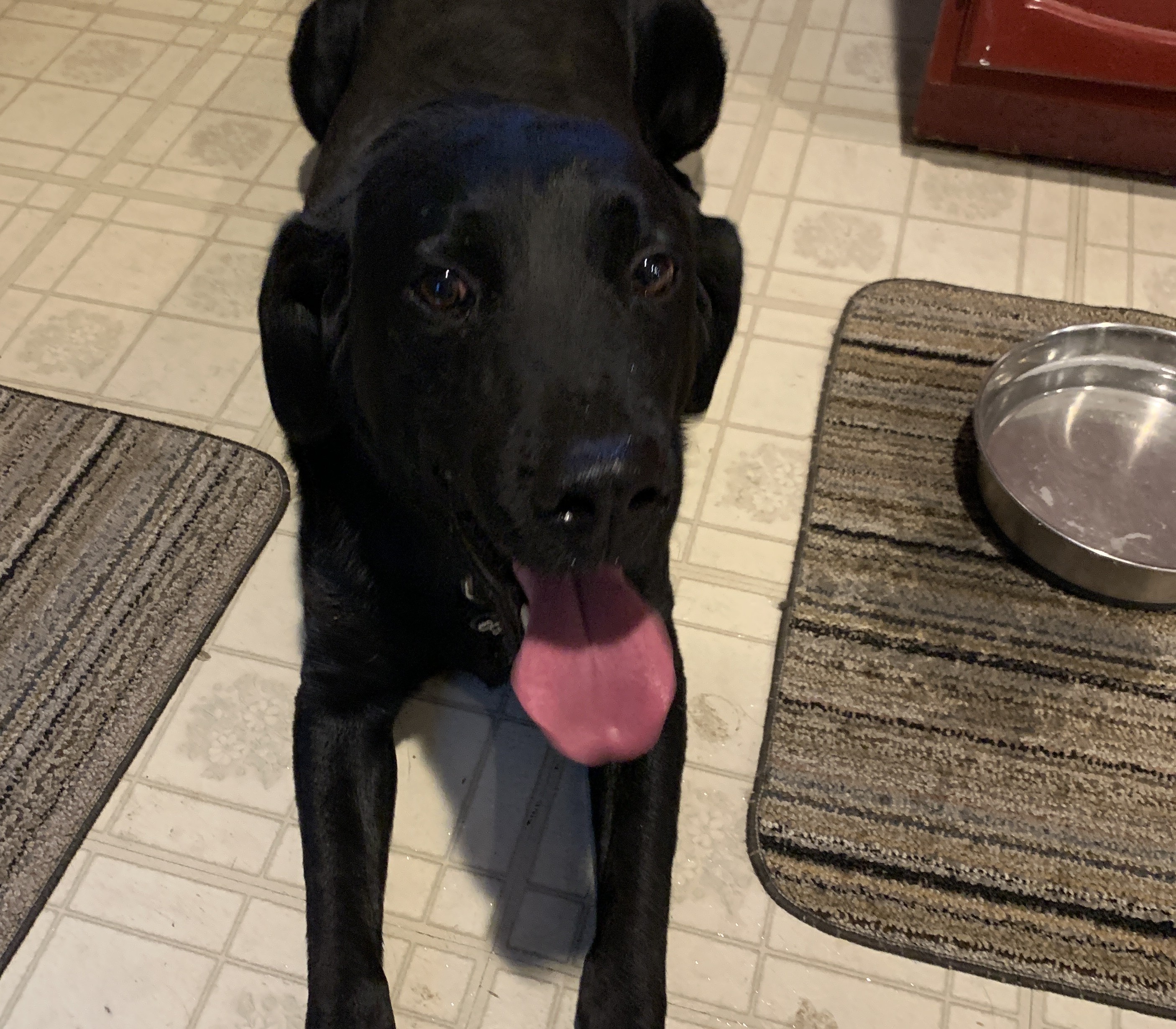 Male black lab found with a broken electric fence collar and no tags. We have him at our house. Gave him some water and affection.
