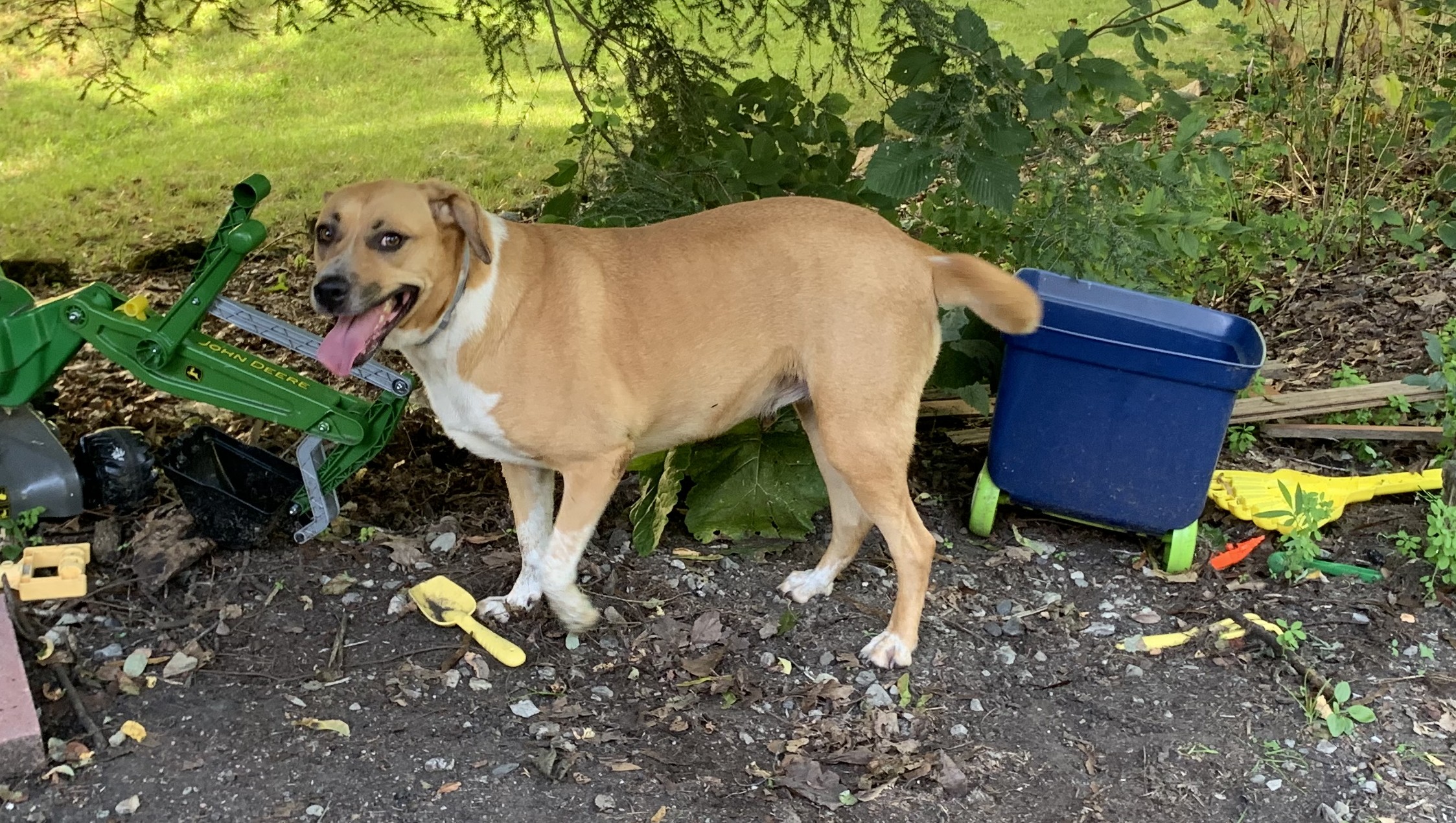 This dog was found wandering around Tree Top Lane in Poughkeepsie and followed me inside my garage. Very friendly, only a tick collar with no ID.