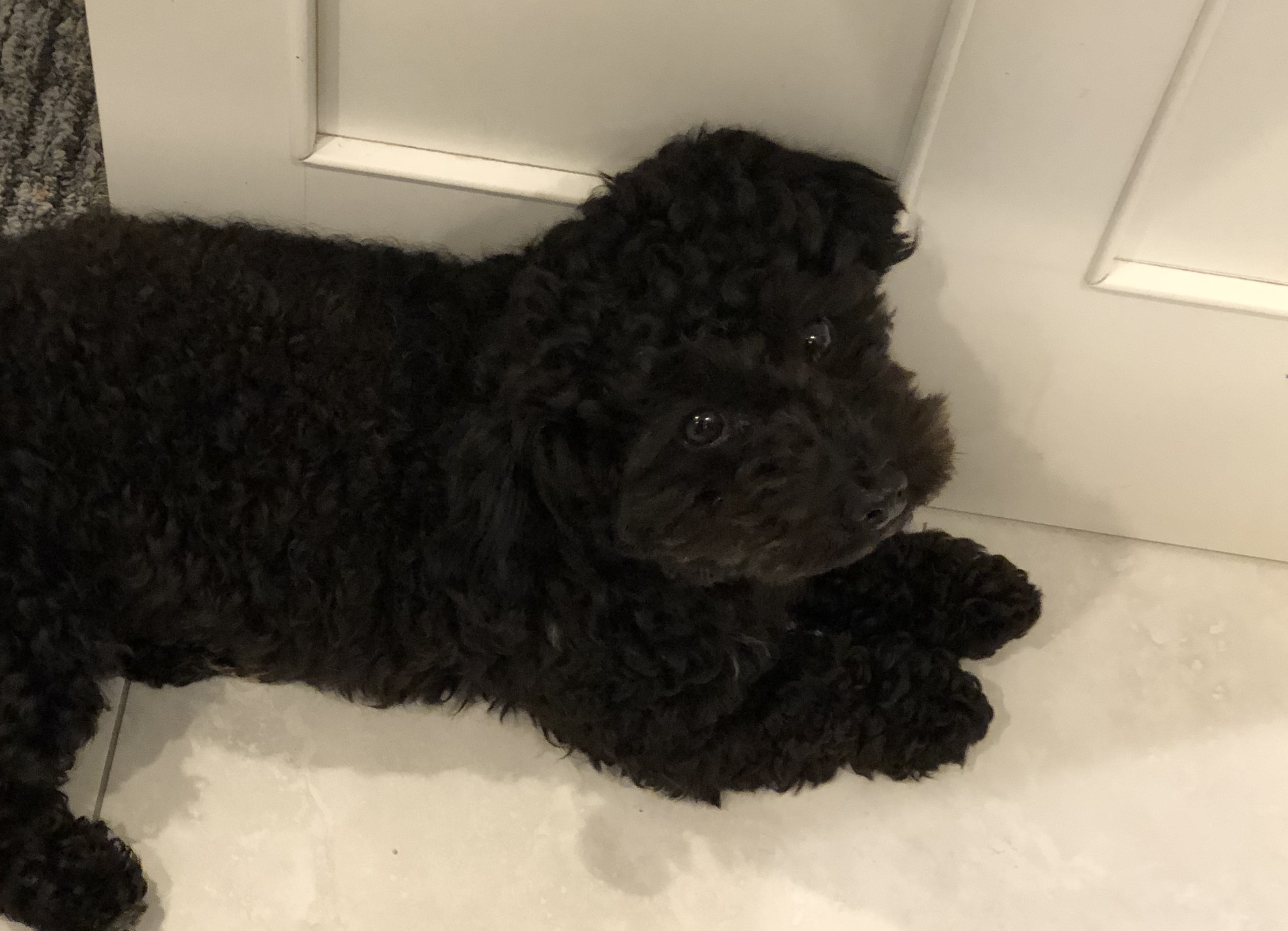 Mookie is a black miniature poodle. He’s very energetic and not shy. He was last seen wearing a light blue leash at 4:00 on April 16 2020 in Mount Kisco, NY.