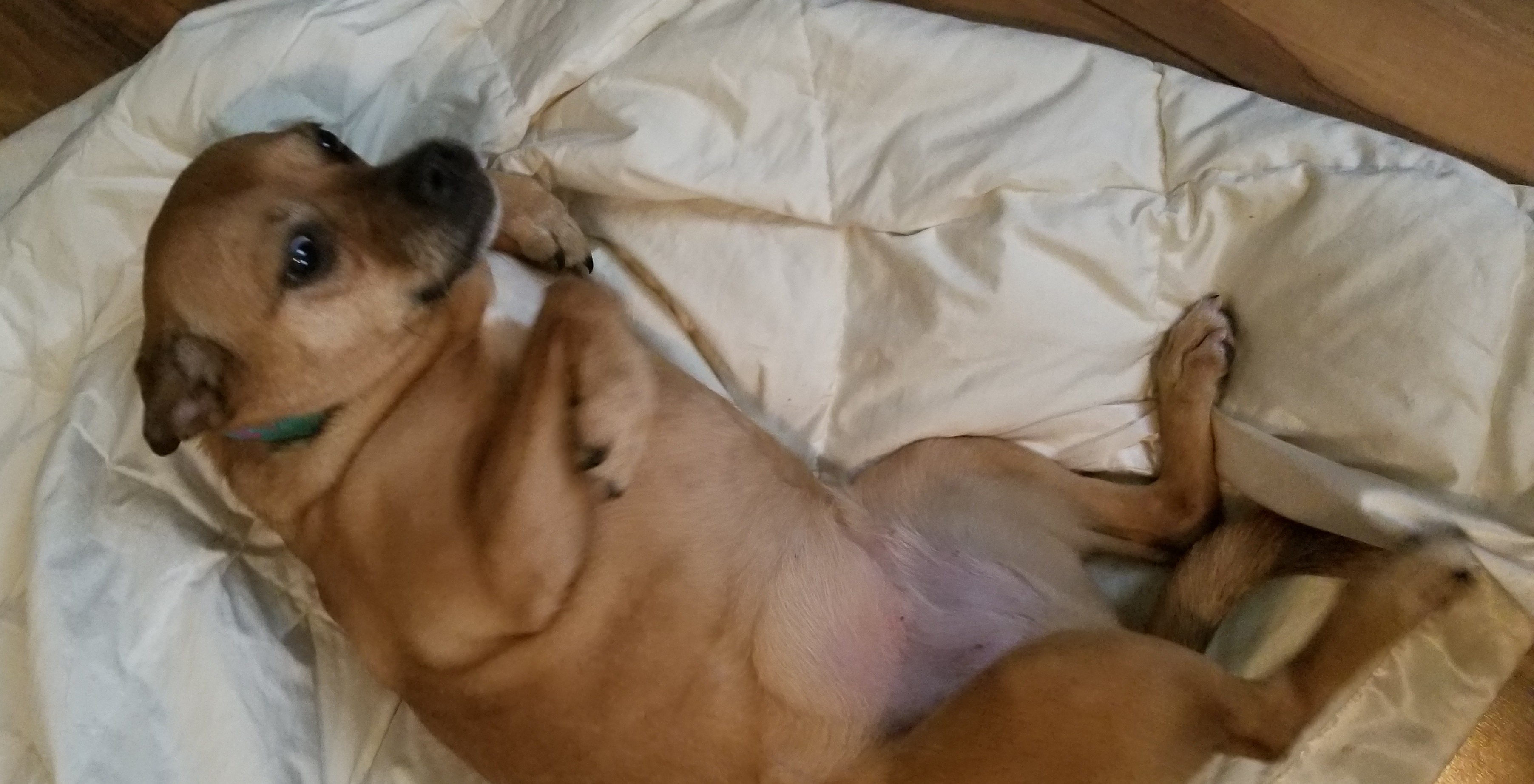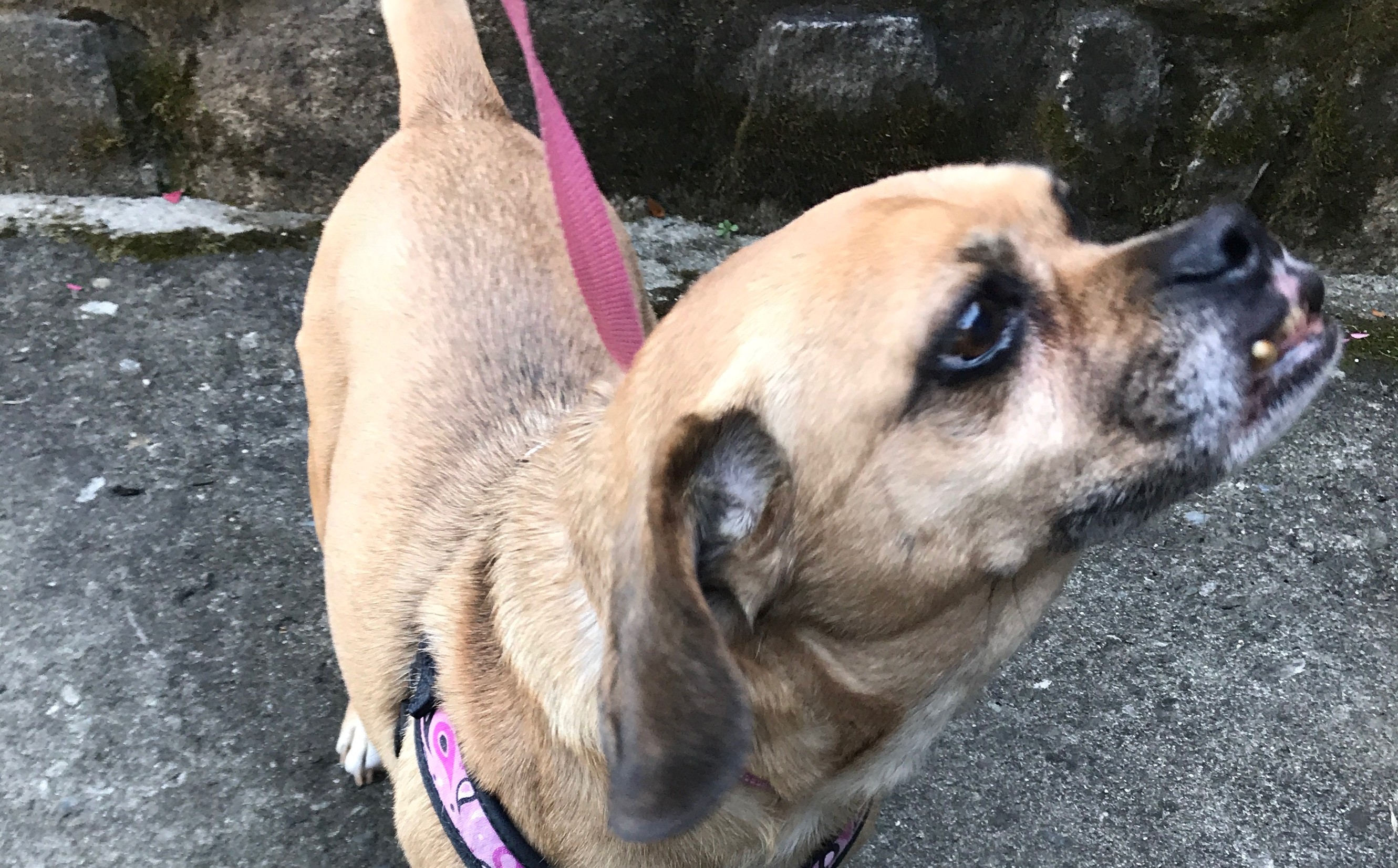 Female puggle, middle to older age, found running down Fair Street near the middle school (Carmel, NY). Wearing a black and pink polka dot harness with no tags. No microchip found.
