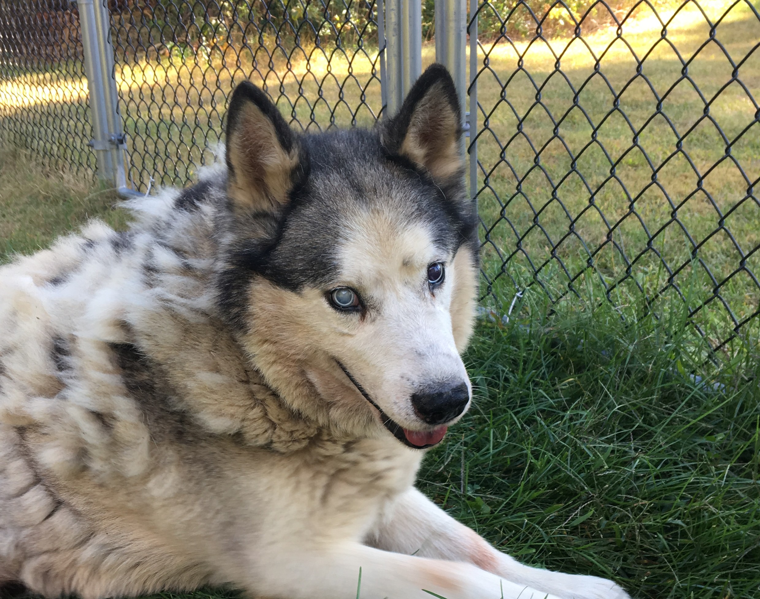 Dog found on Sidney Lane, Wappingers Falls. Was wandering down the middle of road. Almost got hit by a car. A little skittish but came to me. Has collar but no tags. Appears to be blind in one eye. Very matted hair. I have her in a fenced in yard. She has had four bowls