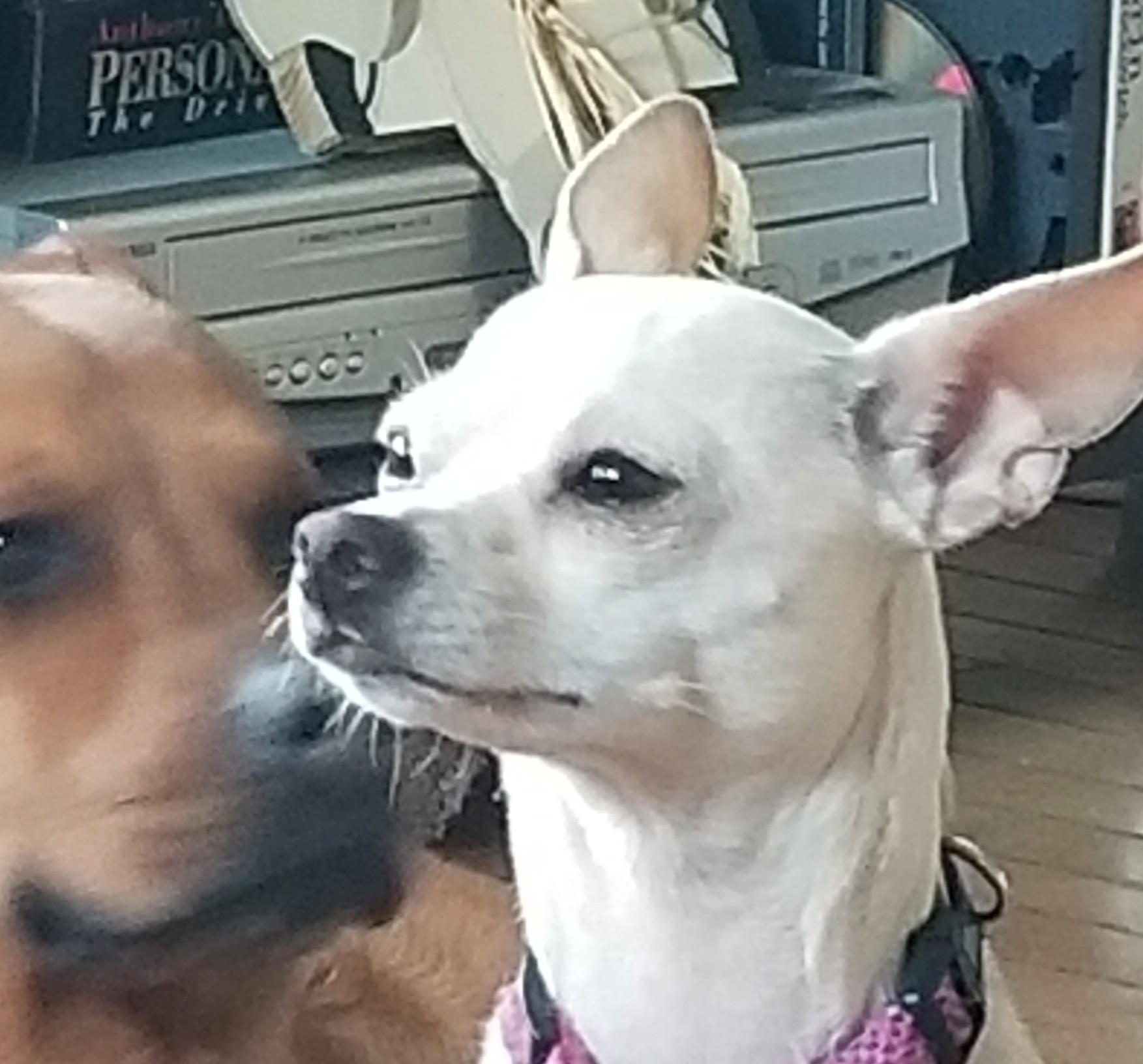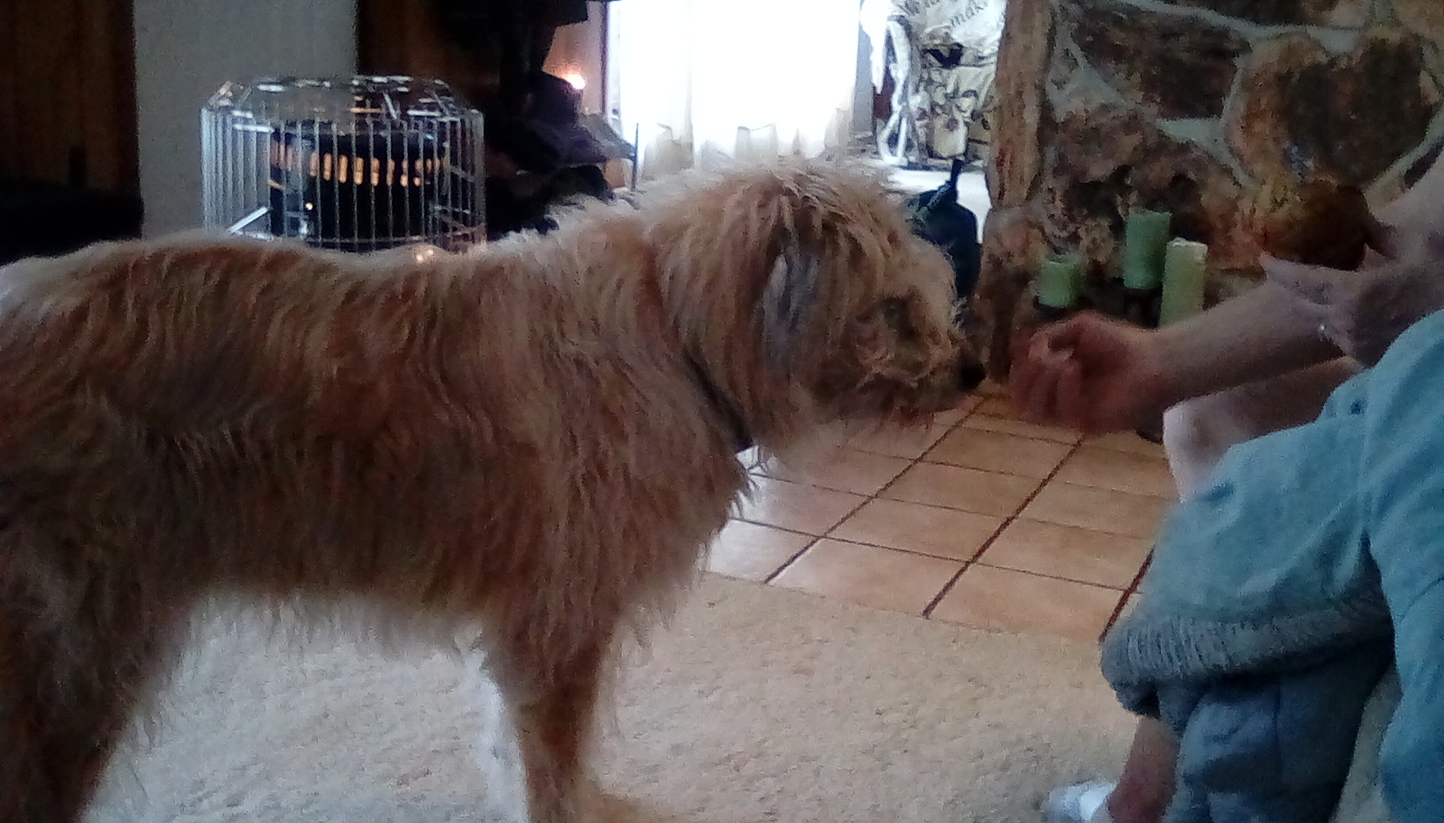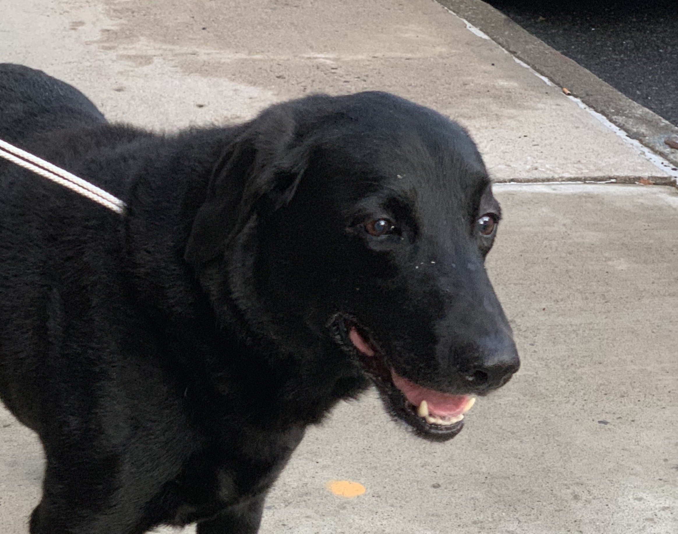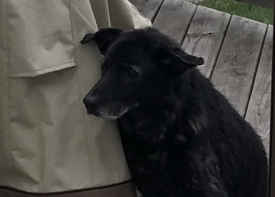 15 yr old black lab Jessie. Very skinny. Bushy tail. Wearing a red shock collar. Very friendly! Loves dog biscuits, cheese, and pasta with red sauce. Has been failing in health the past few days.