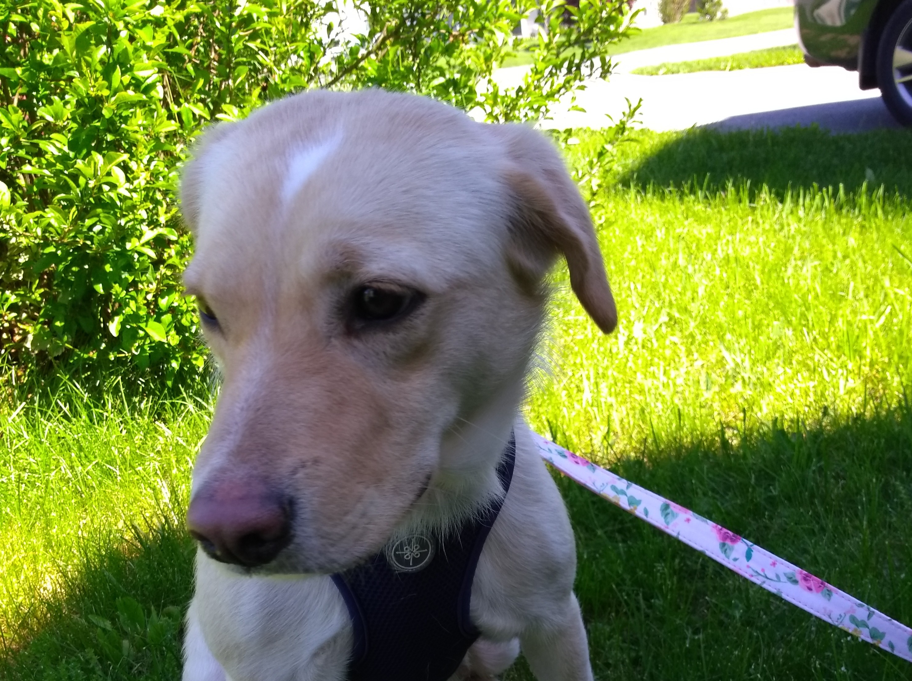 40-lb yellowish dog, very skittish, slipped out of harness at 11 Waldorf Place, Poughkeepsie, NY 12601. Has microchip.