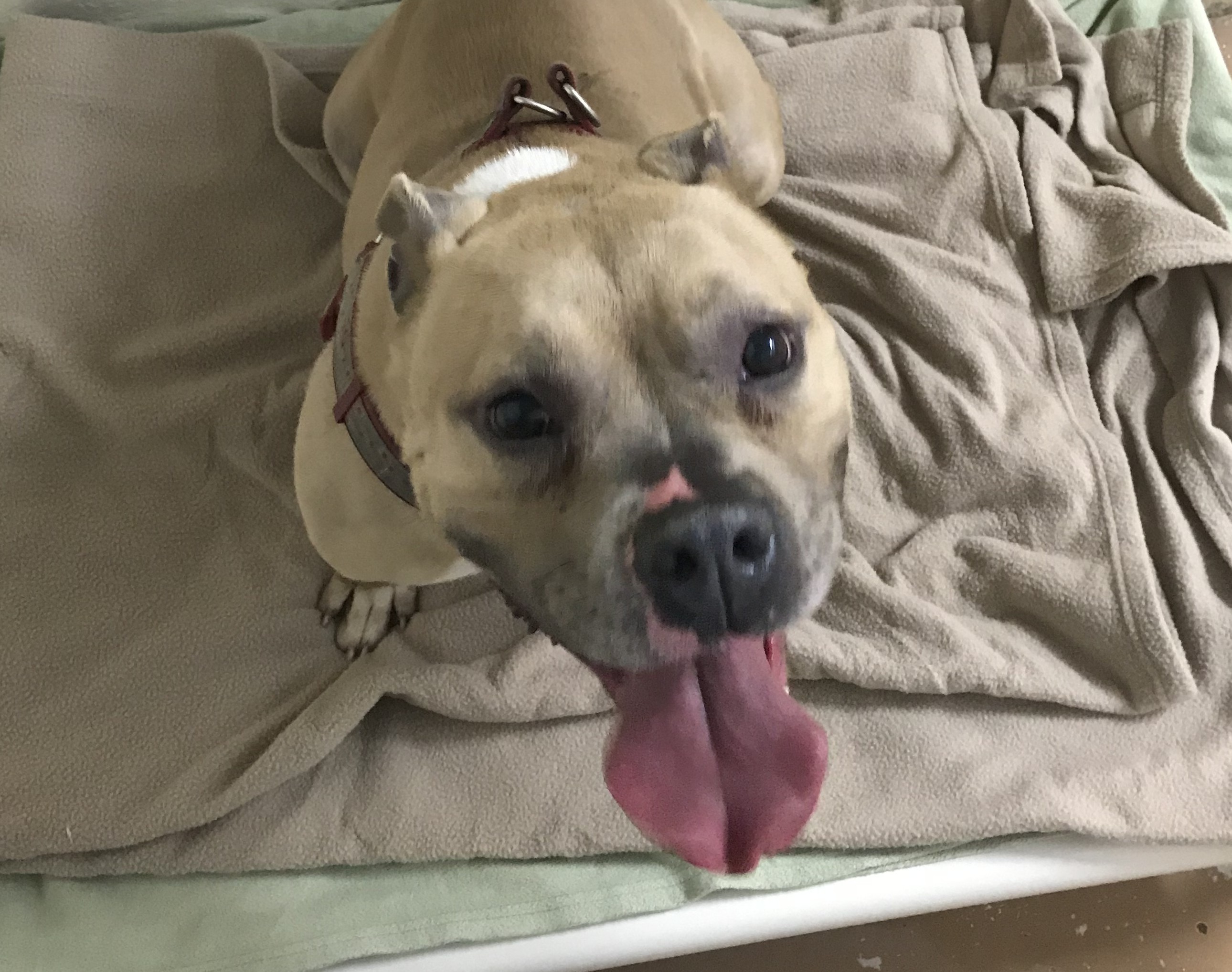 We have a tan male pit bull that showed up at our house. He is wearing what looks like an invisible fence collar. No tags though.