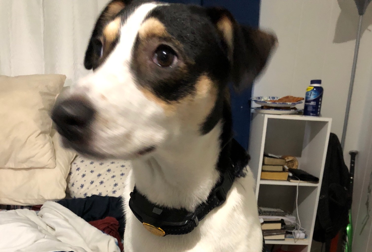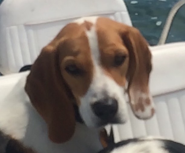 Male Beagle just over 1-year old, answers to Kodi or Kodiak. Wearing a black Carhartt work jacket.
