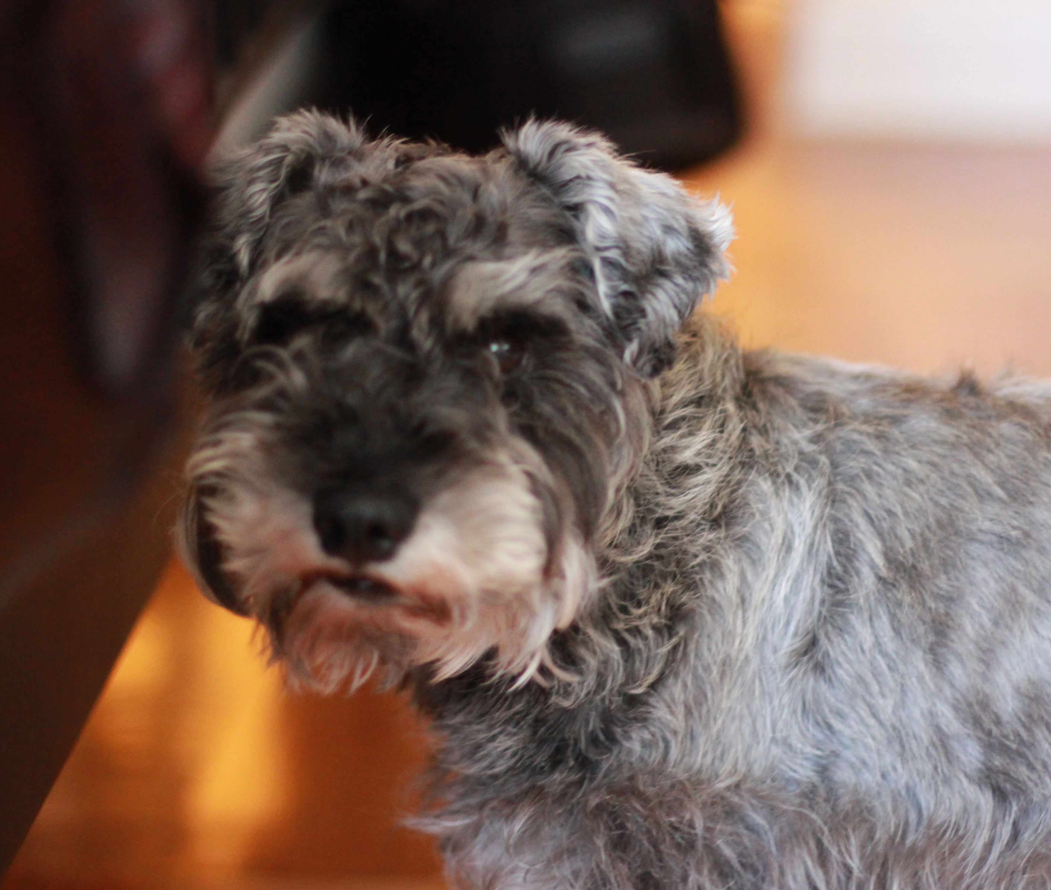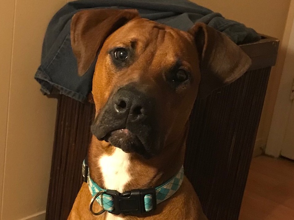 Answers to Charlie, all brown with a white chest, wearing a blue collar. She is one-year old.