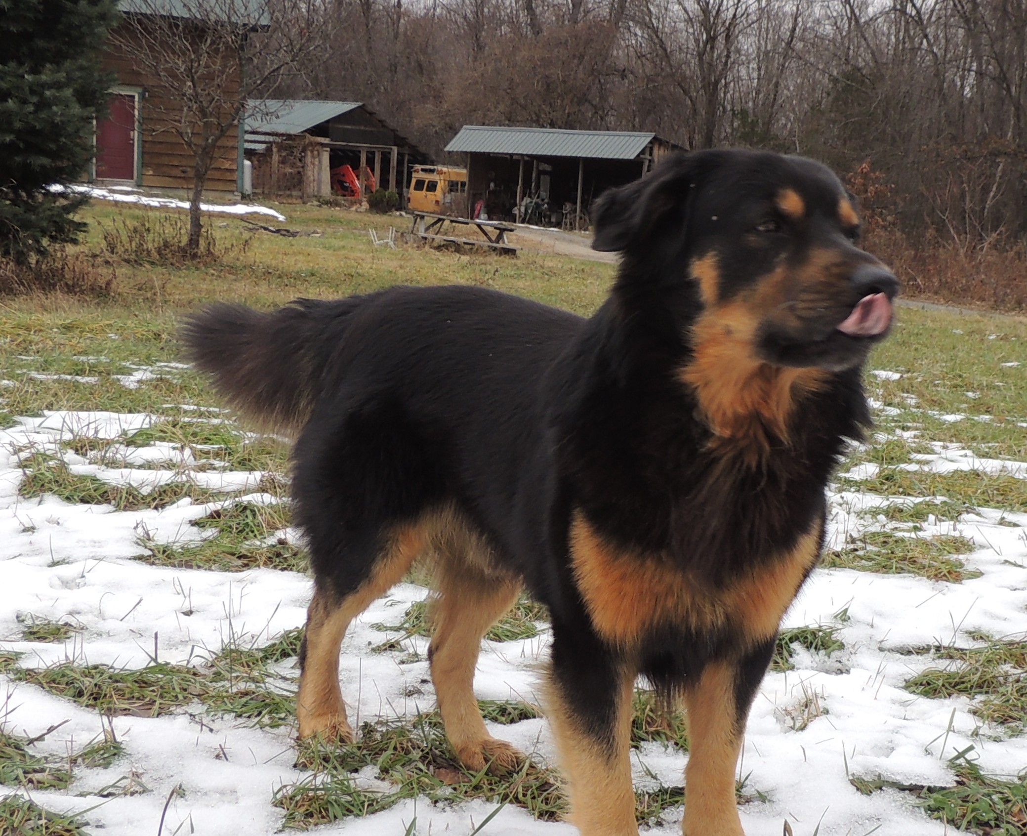 Old, un-neutered, male farm dog, long-haired with Rottweiler markings. He's pretty calm, often aloof to strangers, but loves food. A more identifying yet less endearing characteristic, a skin rash above his tail at the moment.