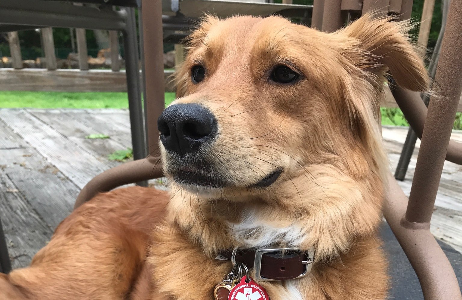 Found: Young dog with a metal choke collar. Very friendly. Is trained. Loves kids. Likes to fetch stick. Well taken care of.