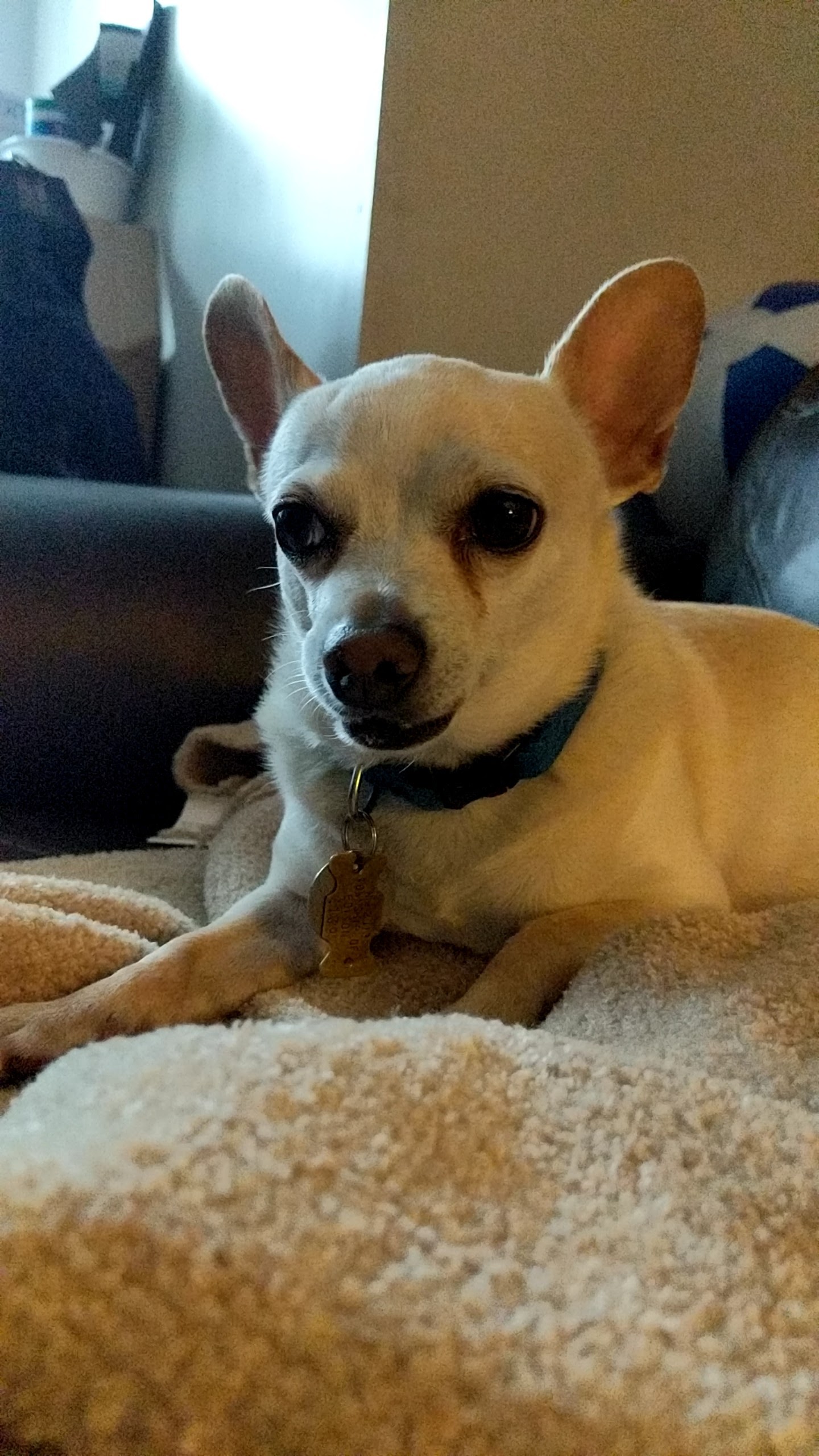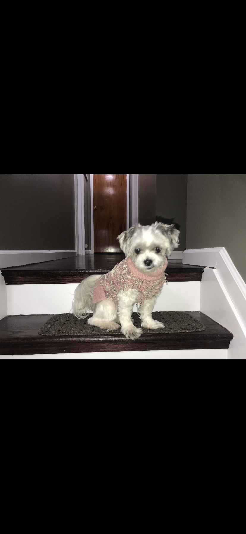 She was last seen chasing an animal Friday morning while taking her out to use the bathroom. She’s sick taking medicine at the time. She was wearing a white cone and a blue sweater.