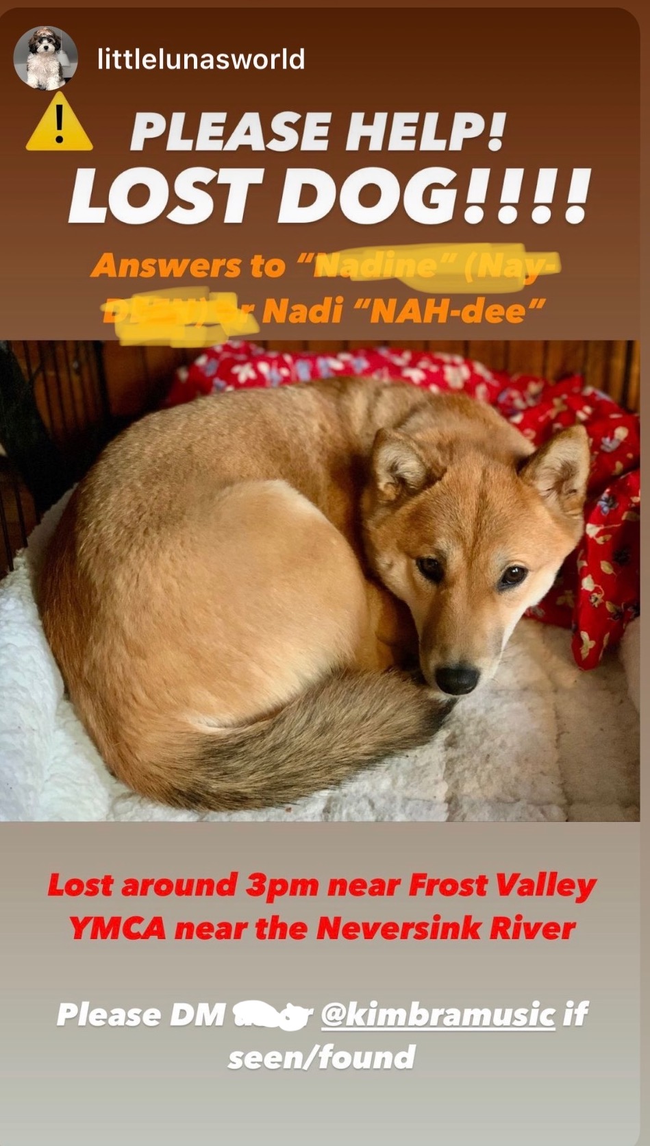 Hi all. Our names are Kim Johnson and Adam Paiva. We have lost our darling puppy named Nadi (pronounced Nah-Dee) near the Neversink River in the Catskills. For those of you who hike, she went missing by the Biscuit Brook Trailhead. We were also not far from the Frost Valley YMCA. She is a red