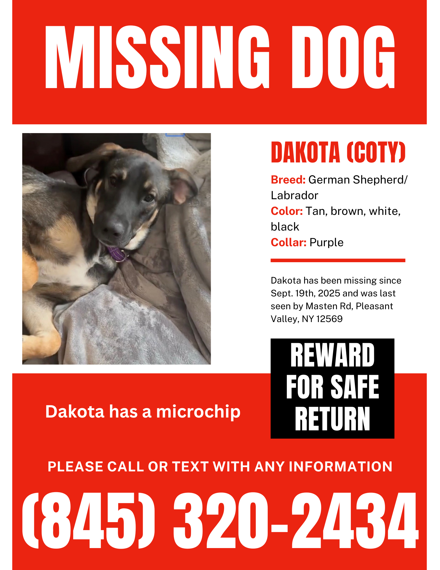 Colour: Black, tan, brown, white Collar: Purple Traits: Energetic, playful, sniffs, happy, loves treats and belly rubs Owner message: We love him so much. Please, if you have any information at all, reach out. Thank you.