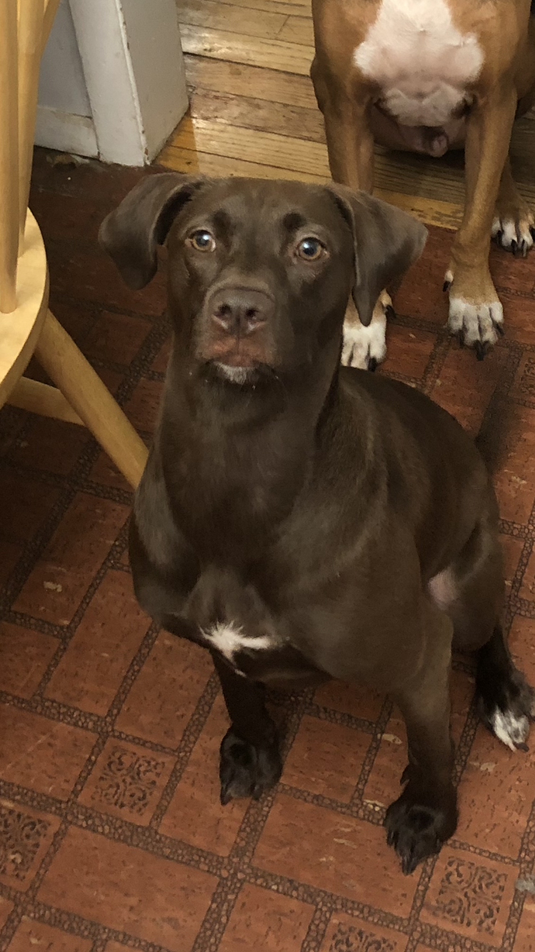 Chocolate brown with white on chest and paws. Female, 2 years old, patterdale terrier, 35 lbs (looks looks a small lab) her name is Xena. No collar, is chipped. Chased after deer, 4:15 pm 9/27/25. Napanoch near Lundy estate area.