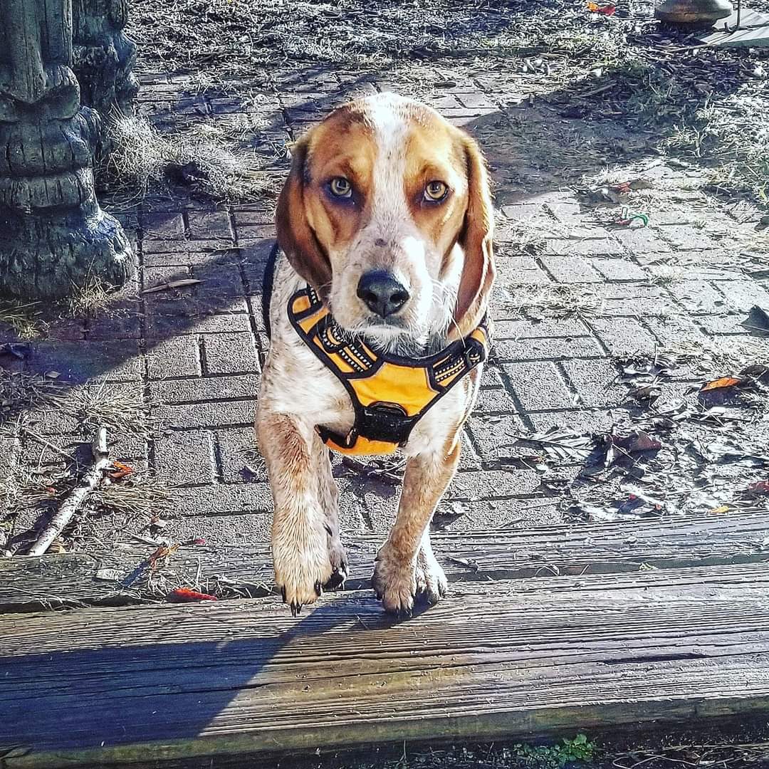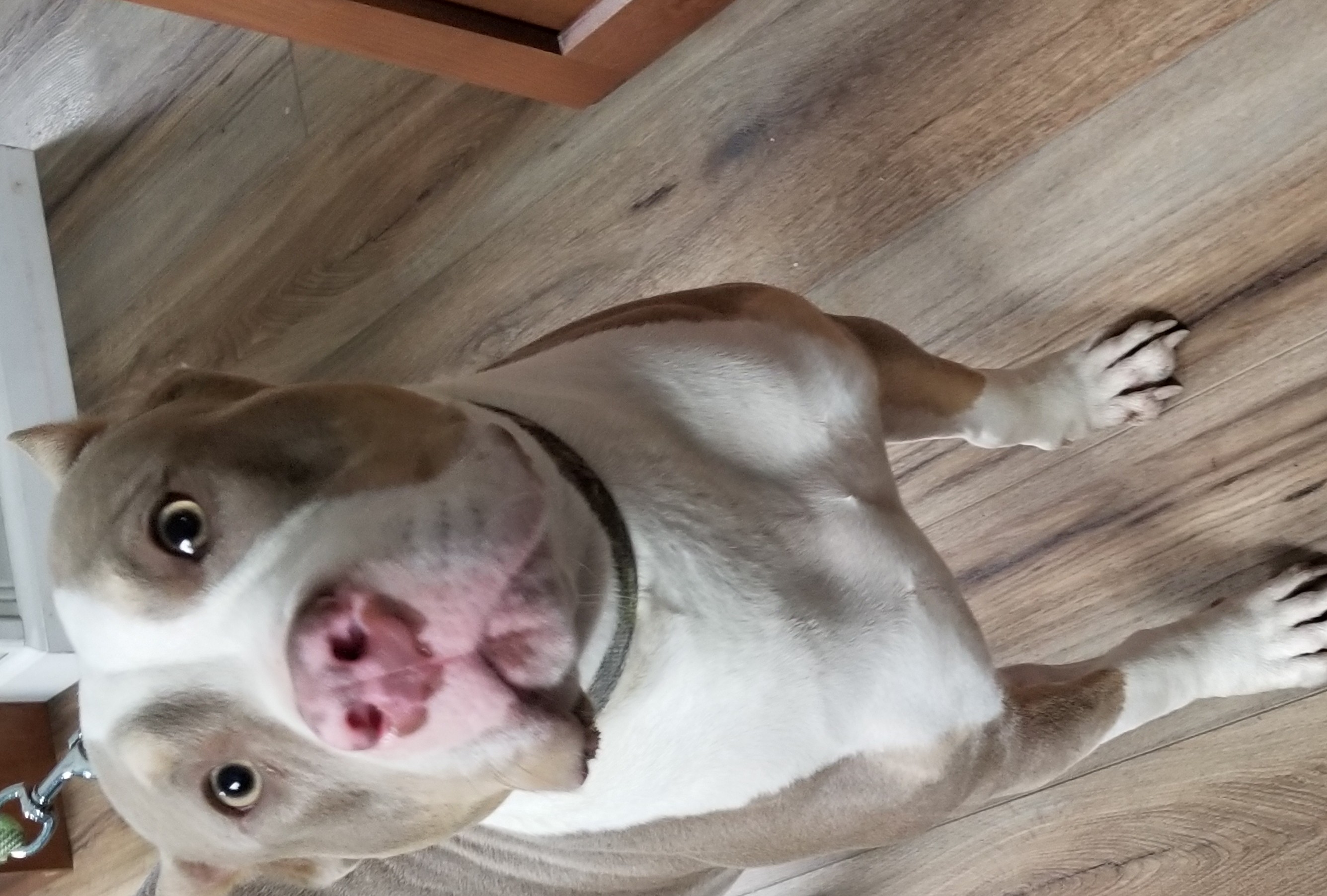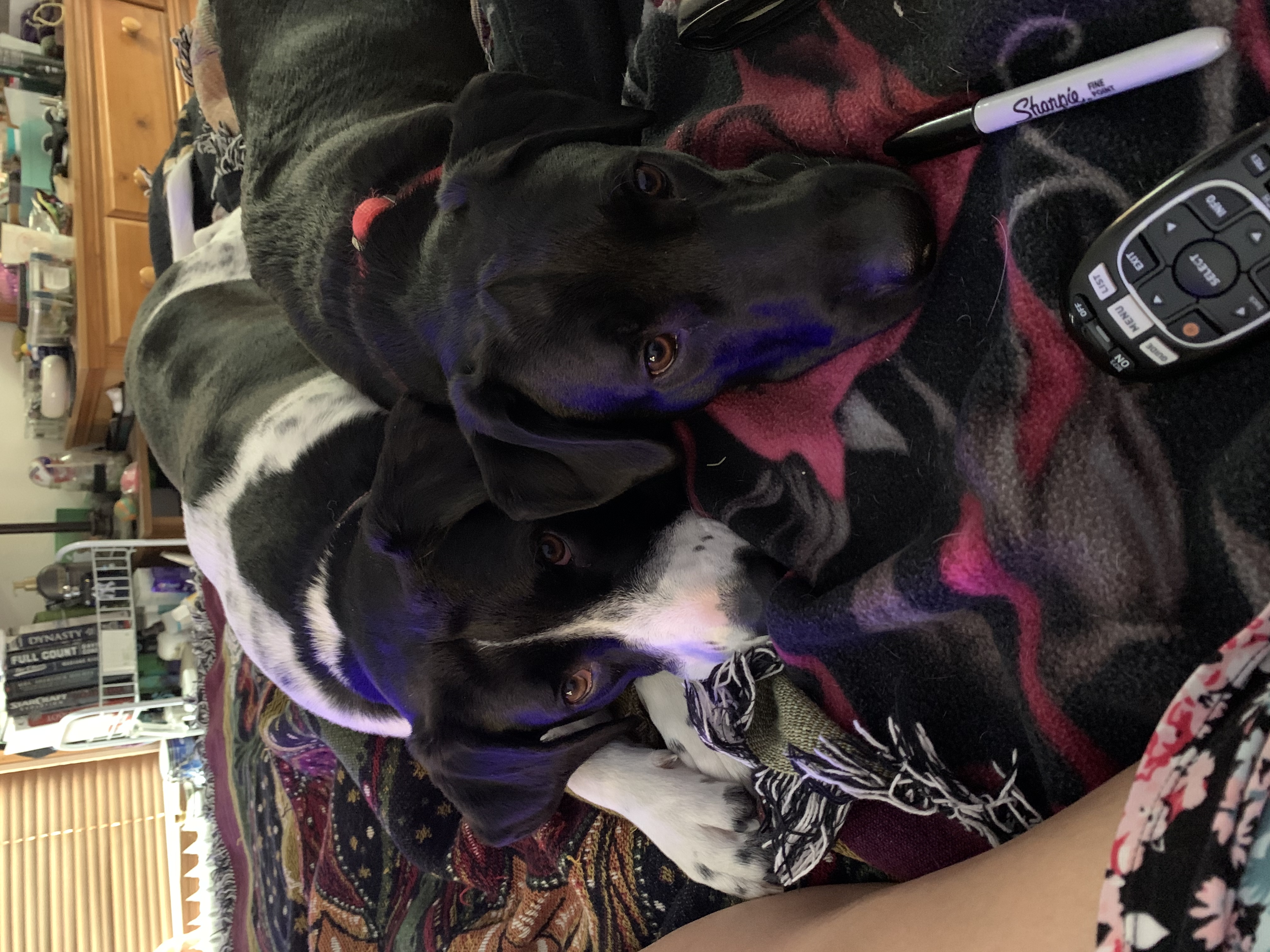 Our beautiful one year old Weimaraner, cattle dog, lab mix, male, and our four-year-old lab beagle mix, female, escaped from my yard today by chewing a hole through the thick fence under our deck. The dogs do not have their collars on because we had gave them a bath and they were on the deck