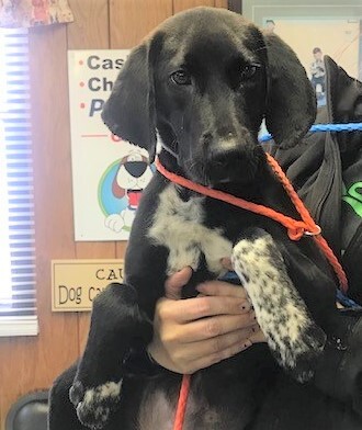 Black hound dog mix with neon orange harness dragging a neon orange leash.