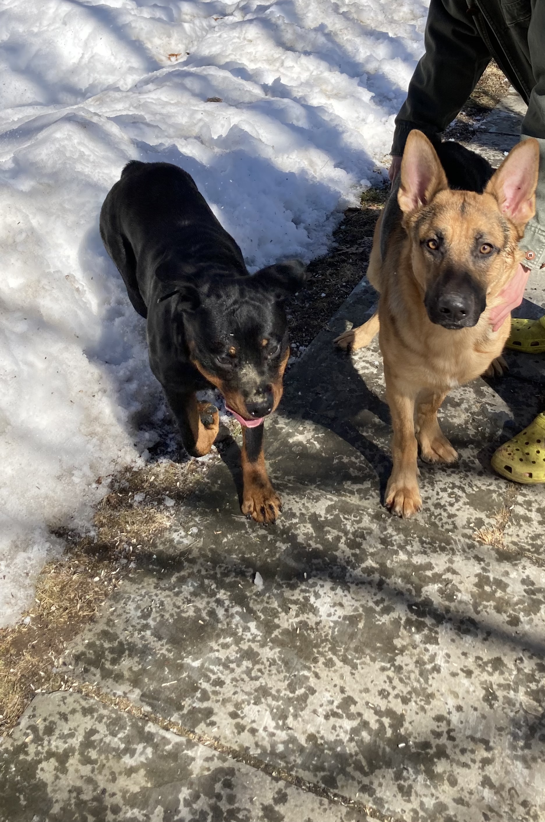 Two very friendly beautiful dogs showed up at about 11AM and have stuck around. One has no collar, the other has a shock collar but no information.