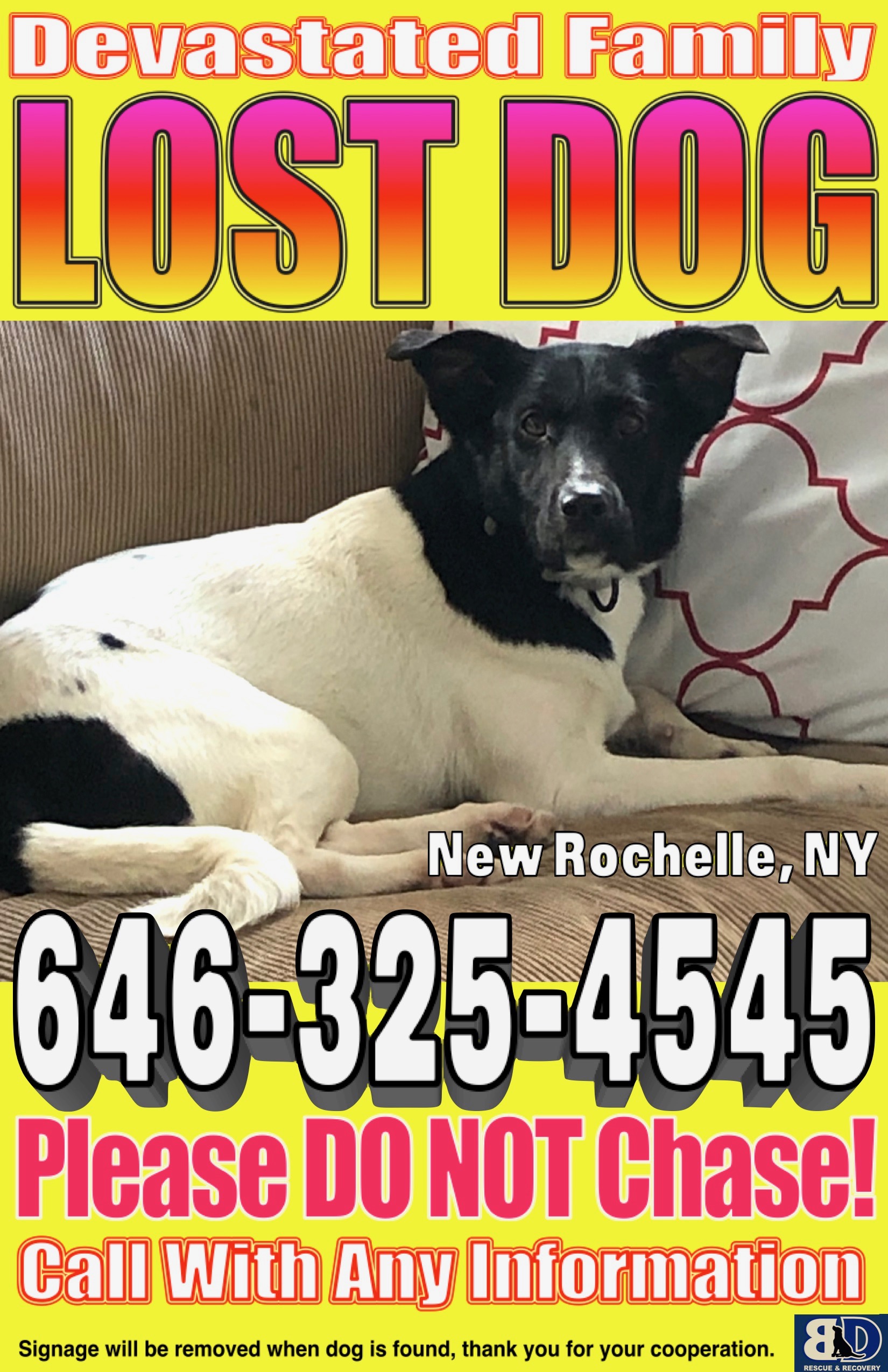 Black and white border collie mix. She has a white body and black face. Grey collar. She is microchipped. She is VERY skittish. She should not be chased.