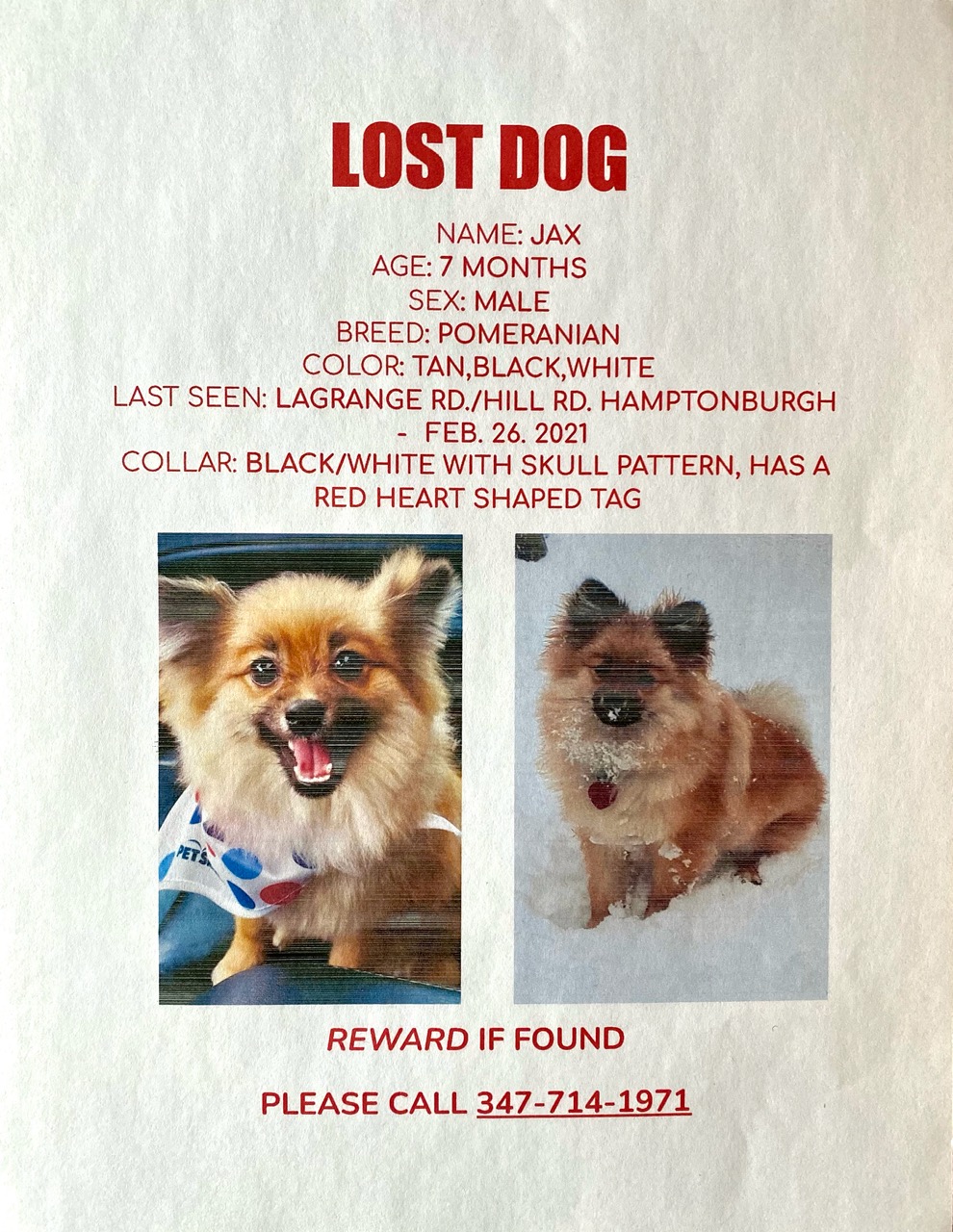 Found this Pomeranian mix on Wheeler Hill in Wappingers. She is very sweet and loves to cuddle. Reaching out to see if anyone is missing this lovely little girl.