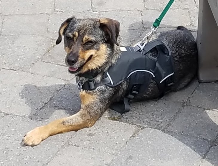 3 legged dog wearing black harness. Weighs about 15 lbs. escaped from fenced yard.