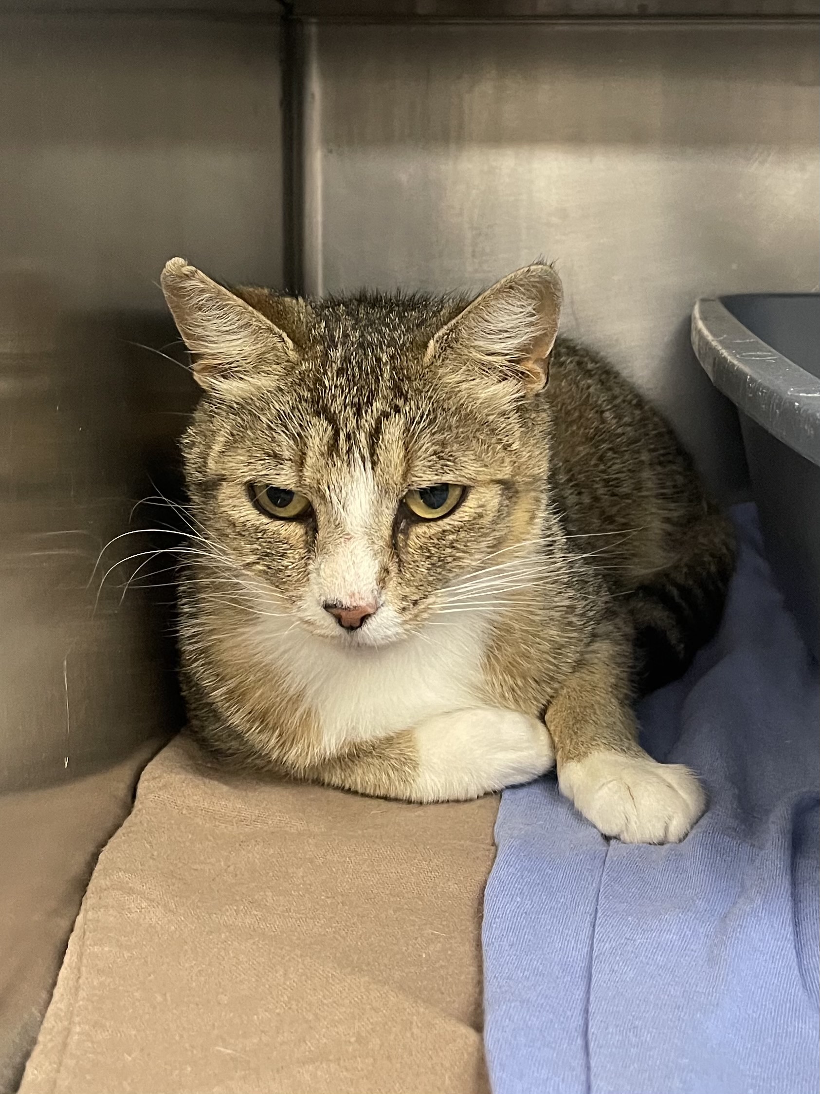 Brown tabby female with white markings found on a farm on Mettacahonts Rd in Accord.