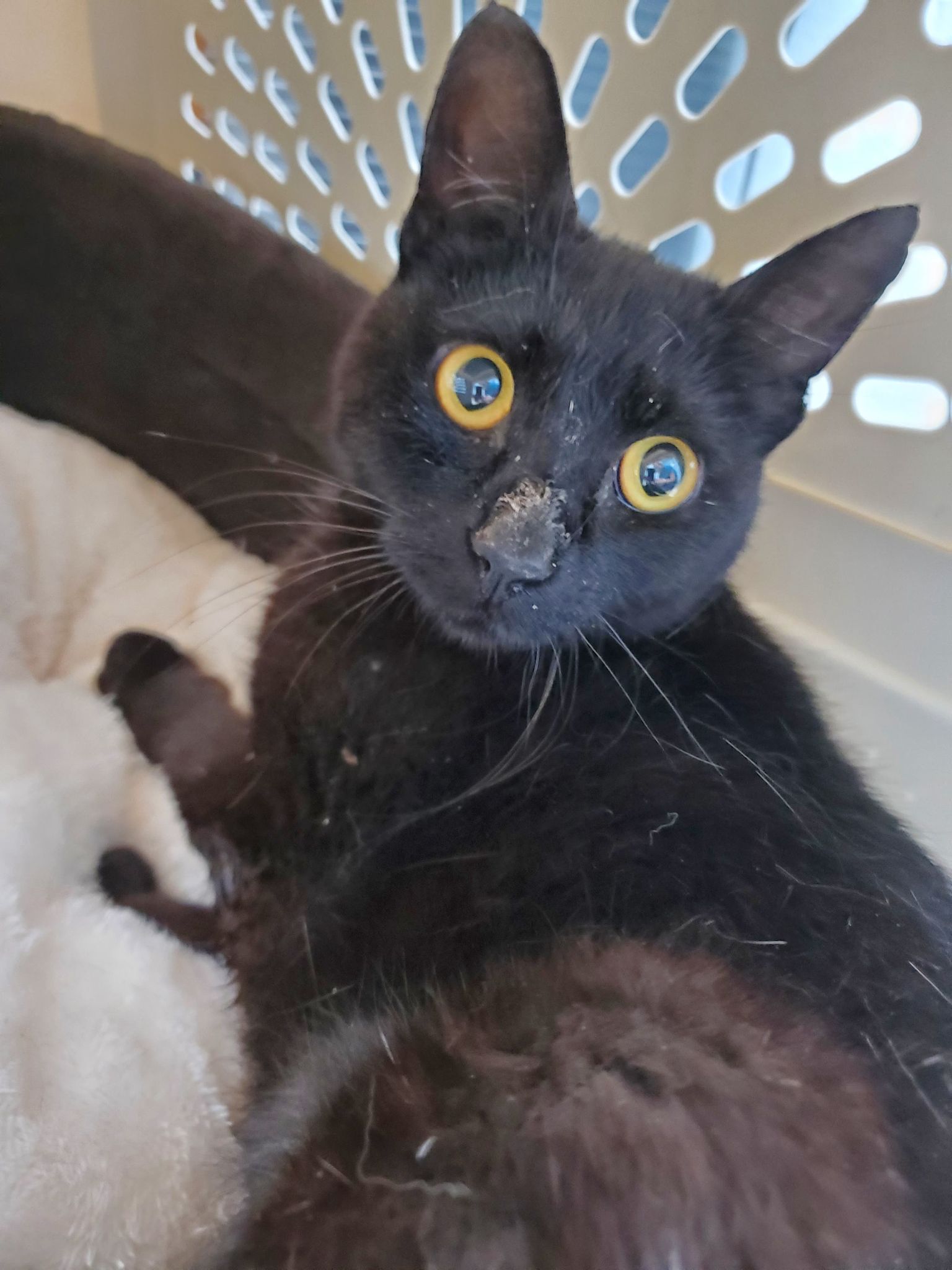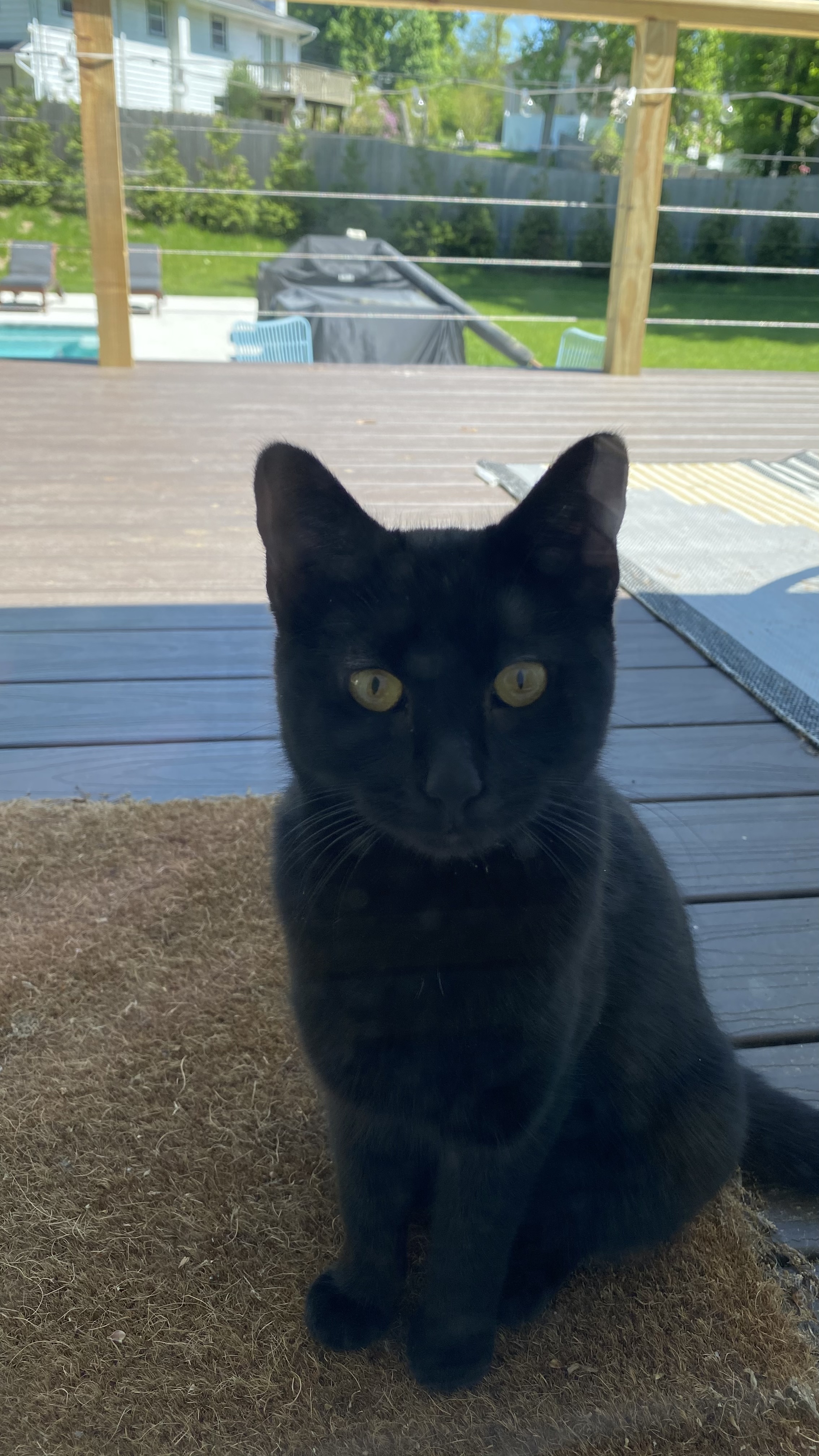 Black female kitten. The Shelter estimates she’s about a year old. Came to our porch, all black, very petite and sweet. Very friendly and huge appetite.
