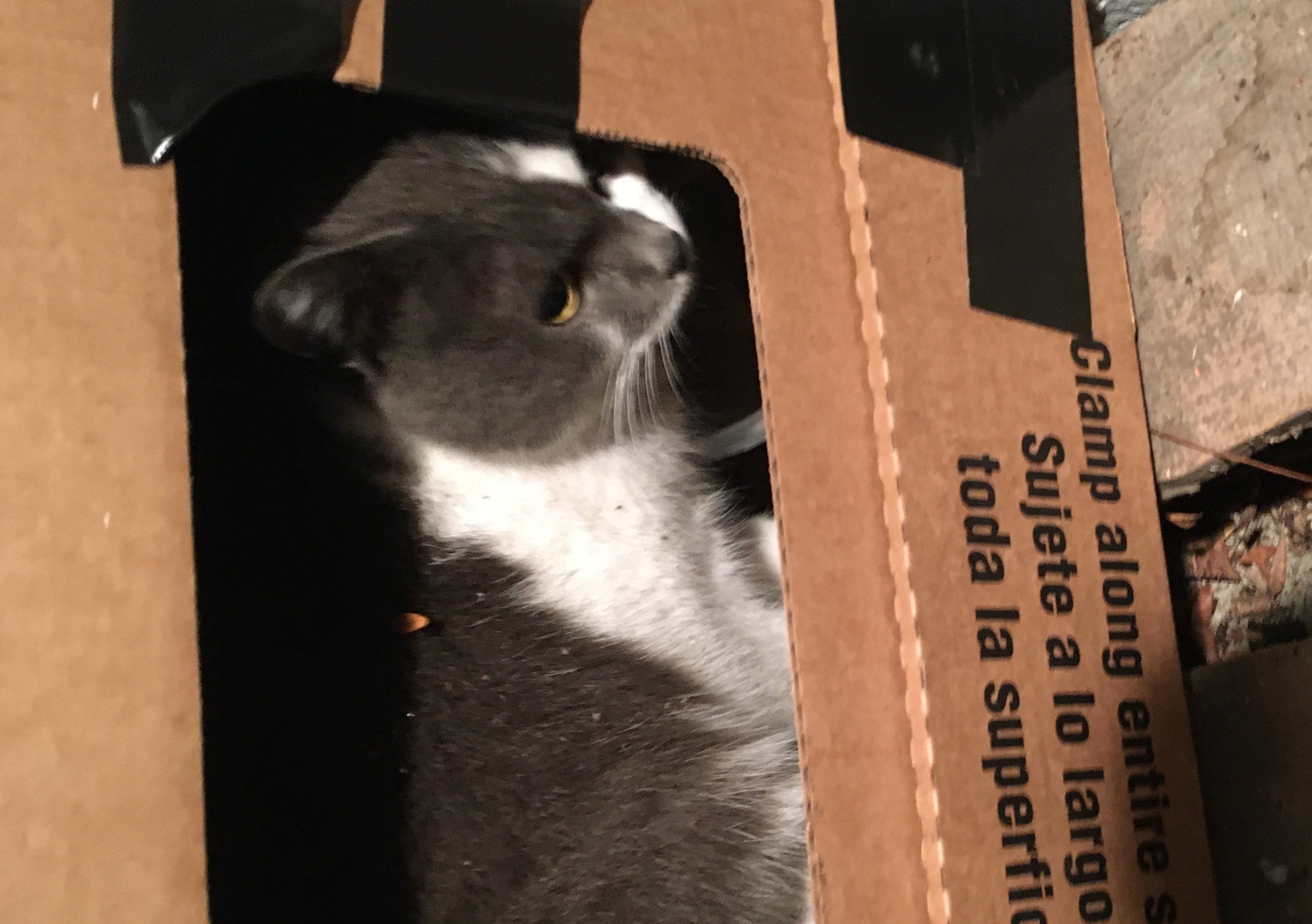 Very big (13 pound) healthy cat, gray on white tuxedo with almost completely missing tail has been coming to my porch, Kerhonkson, Sundown Road near Trail's End, call 845 626-1240.