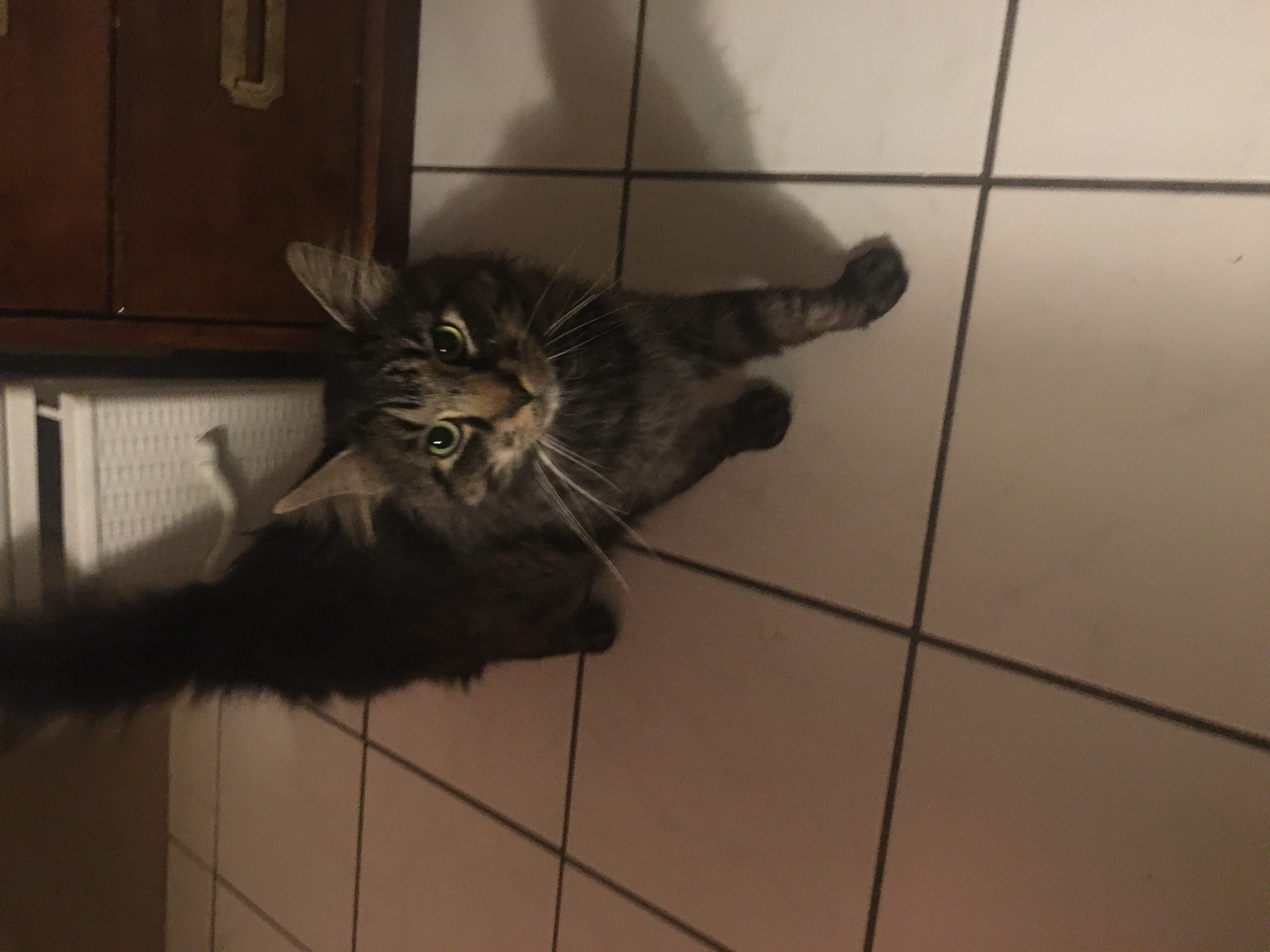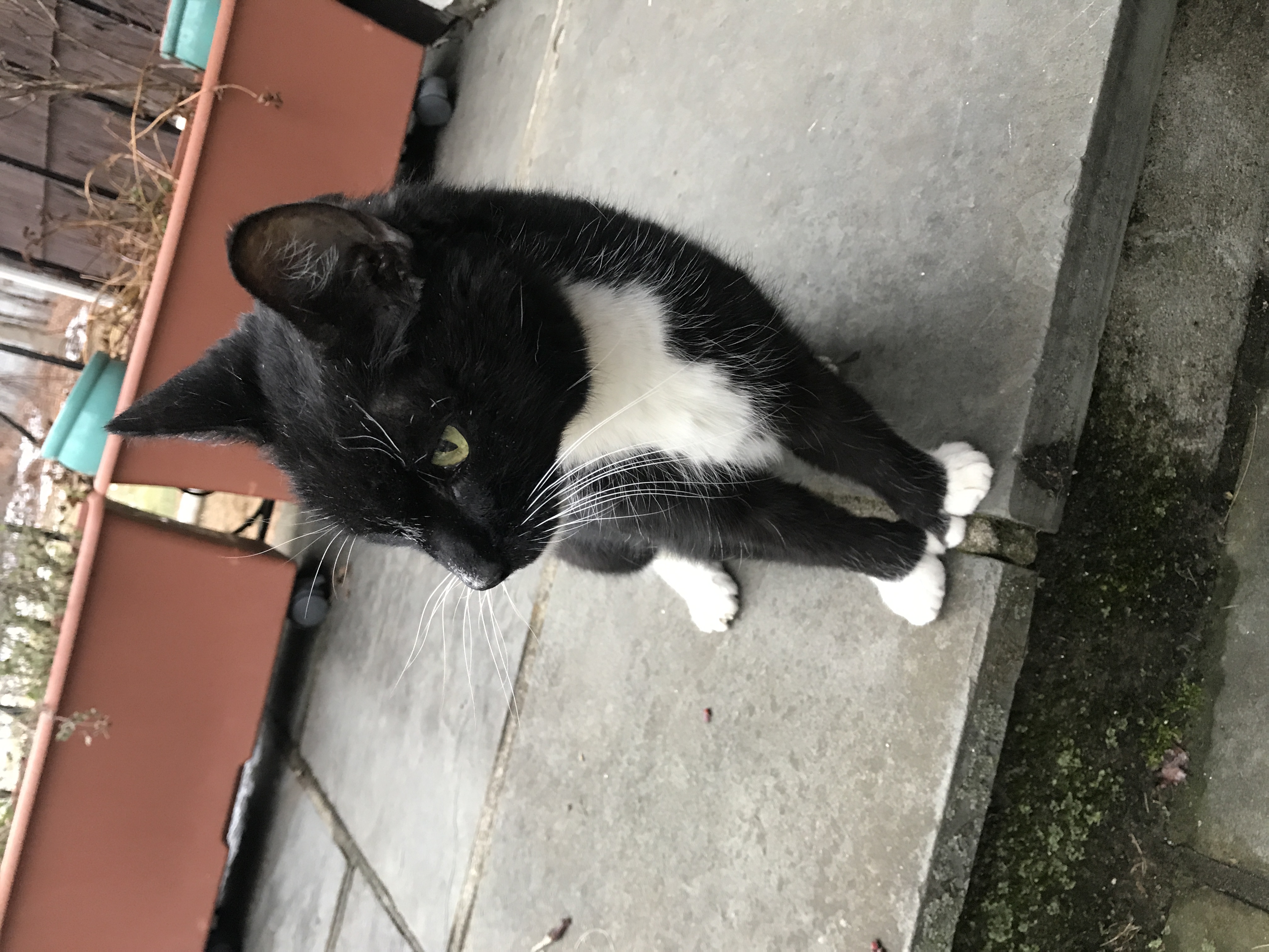 Cat has been coming to my door for food on and off since July 2019. He has gotten bigger since the first year. Sometimes he does not show up at all for a few days and other times he comes here and eats many bowls of food at one time. It looks like someone cut