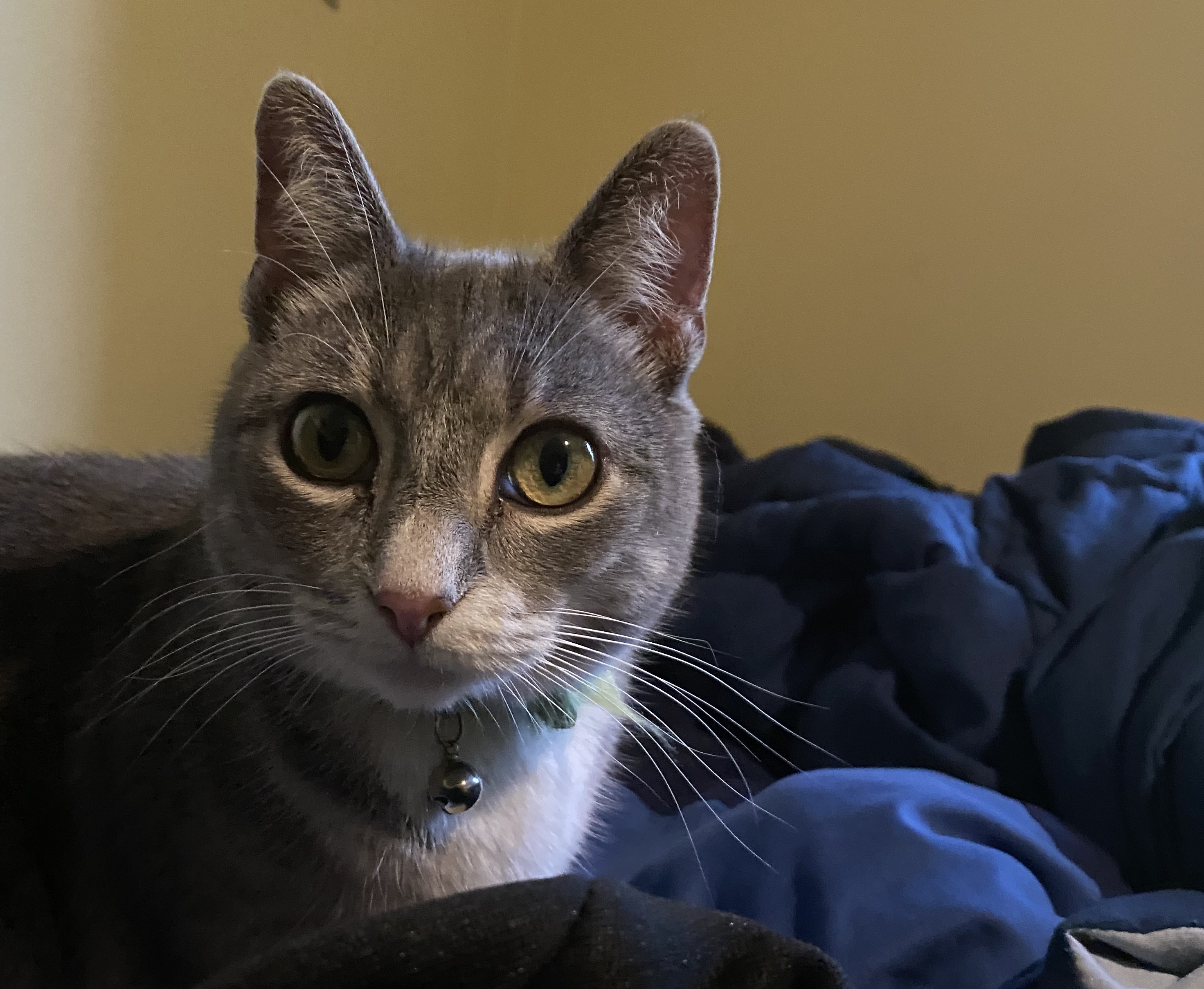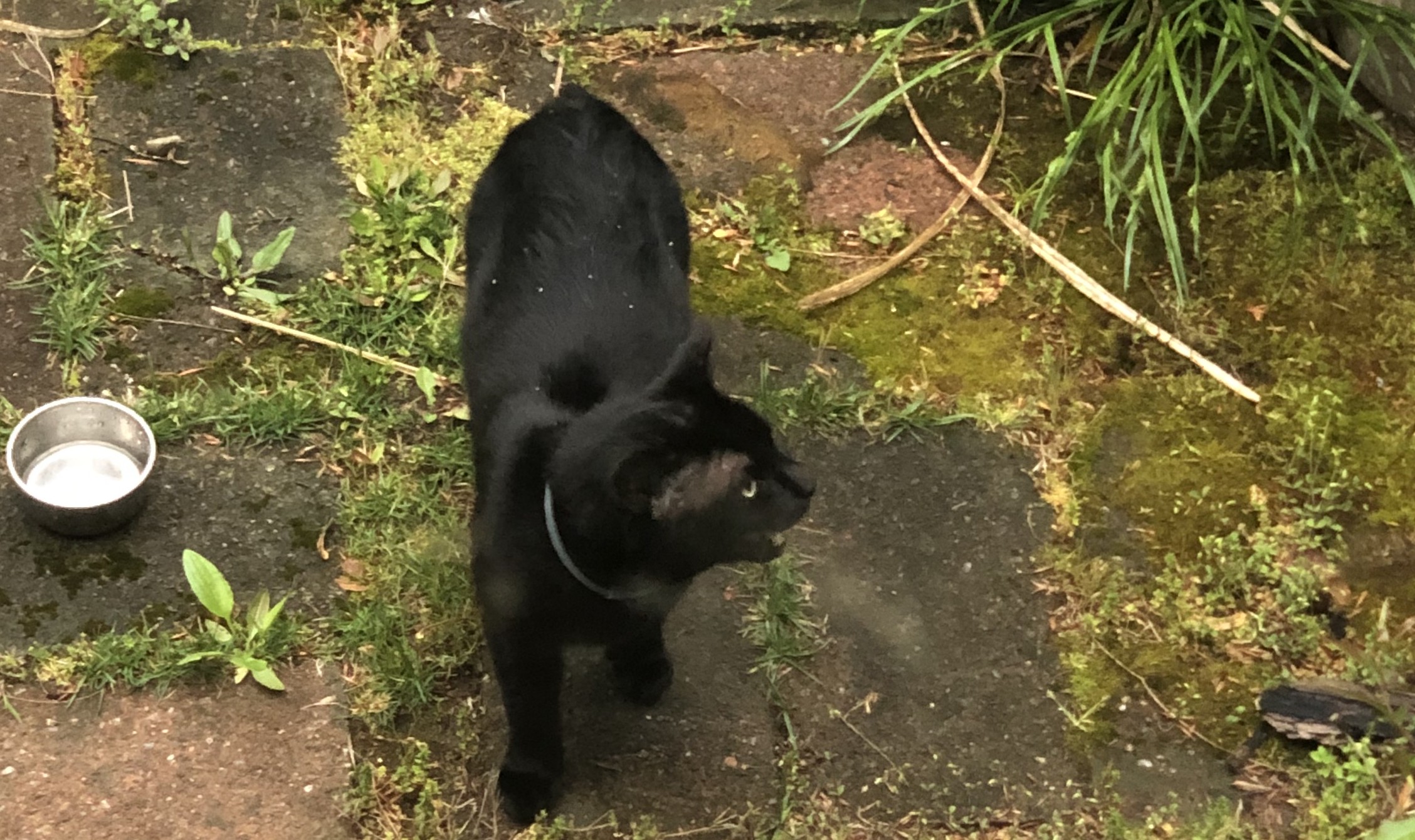 Male black cat with grey flea collar, no name.
