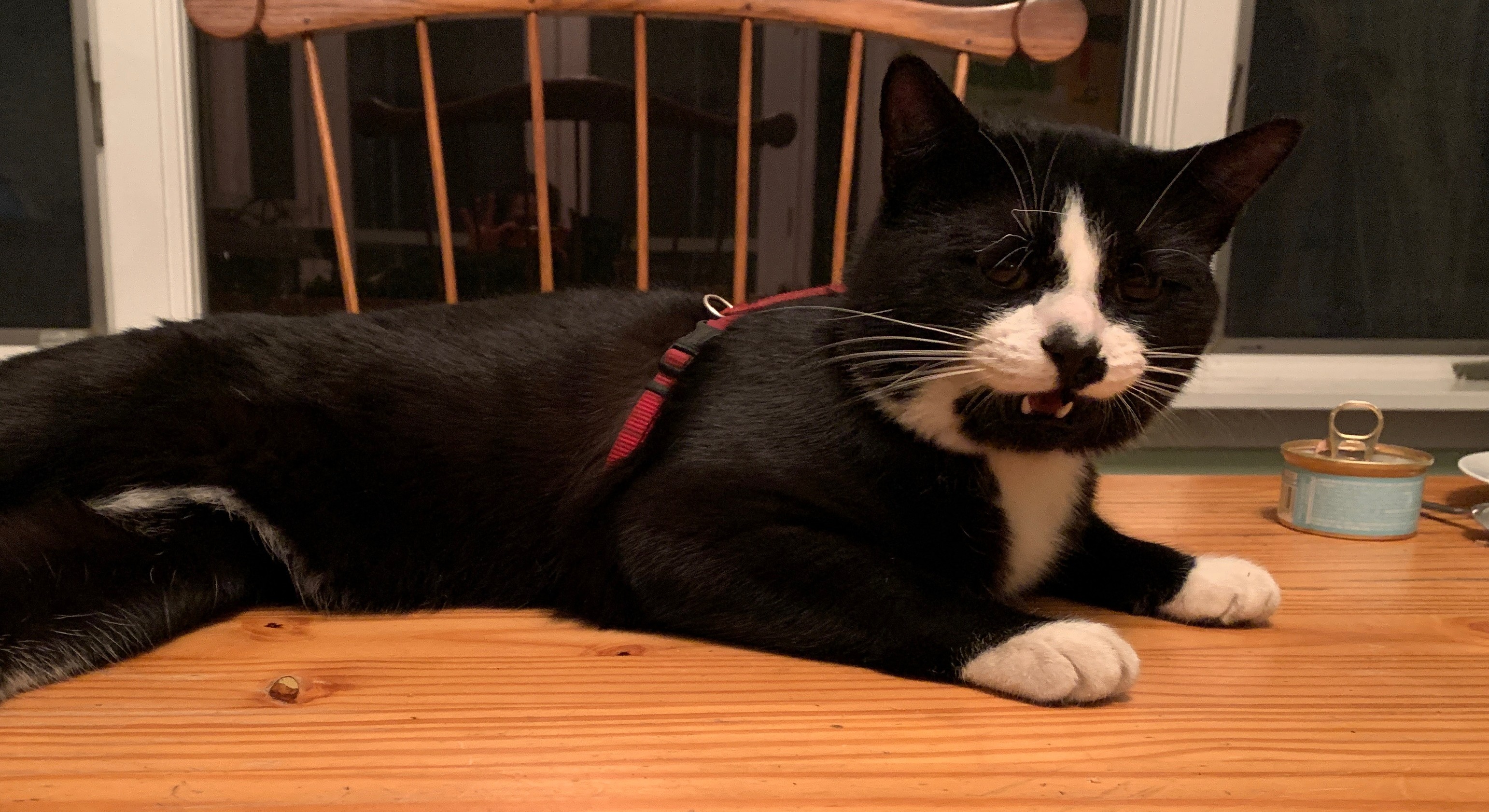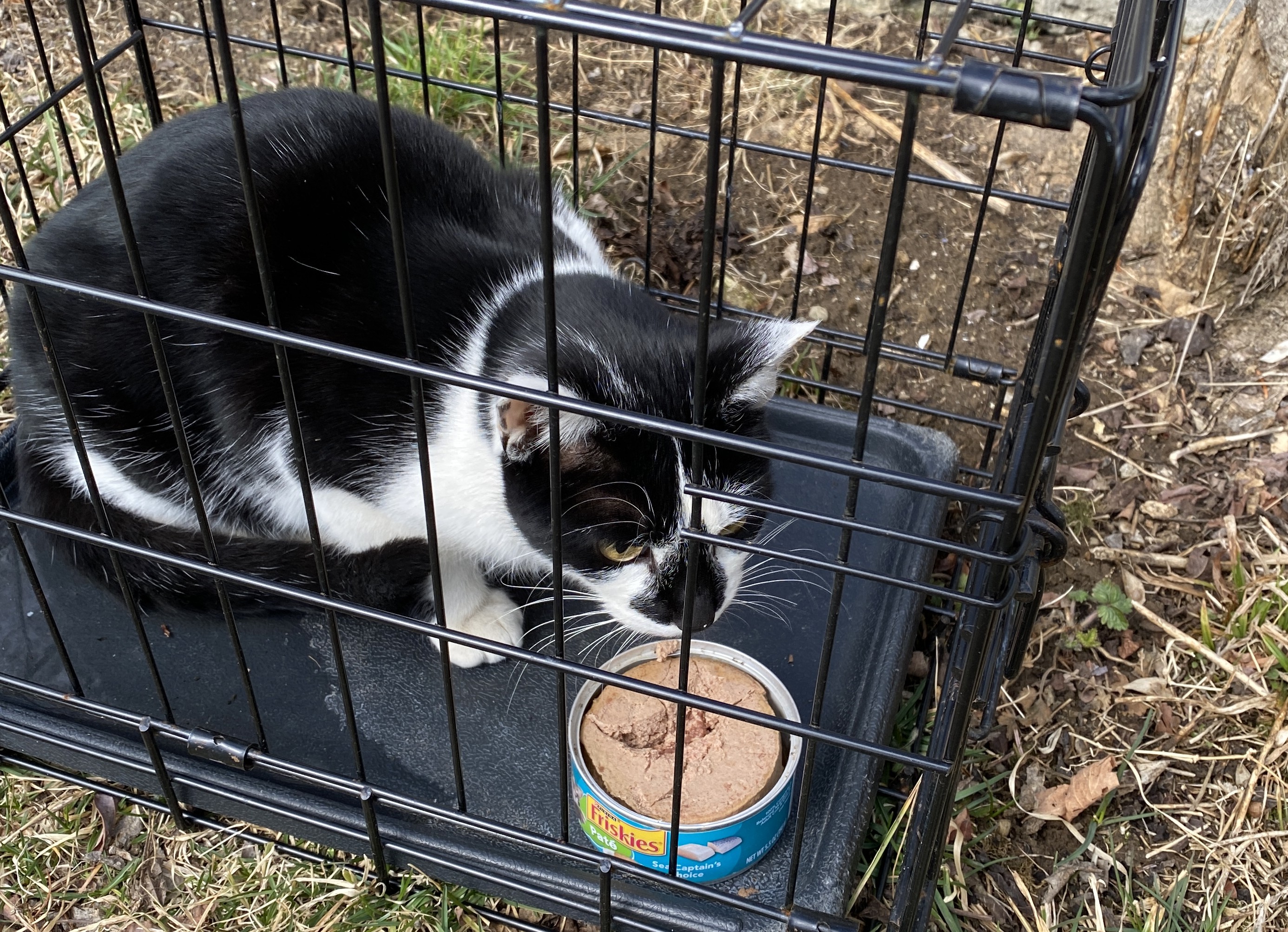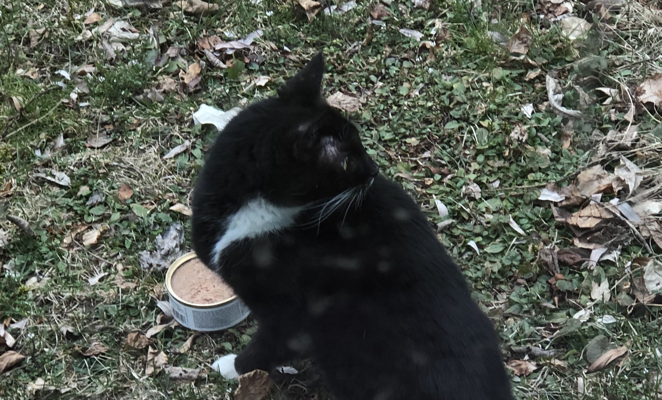 Found in my yard. Black and white cat. All black with white socks. I think he’s been living in my basement this week. Fur is thin at the base of tail. Looks like he / she has been stray for a while. Saugerties / Woodstock border area. I will feed until someone contacts me.