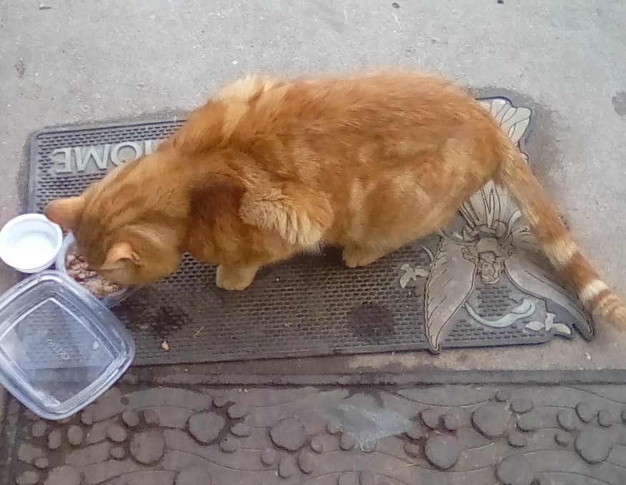 Orange cat. White rings on tail. Comes to eat on my porch.