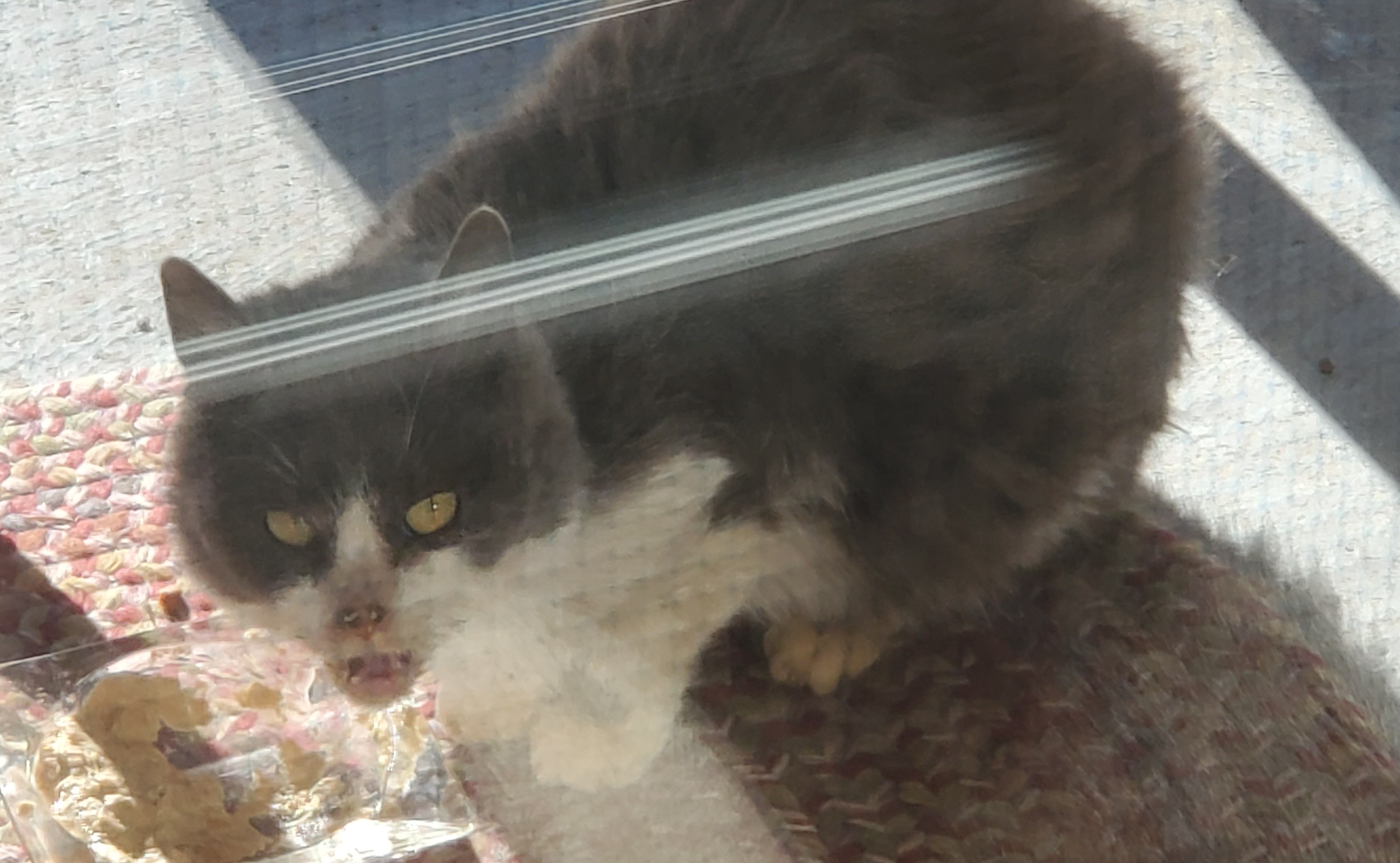 This beautiful cat has been showing up at my sliding glass door, for weeks. My indoor only cat Fella goes bonkers when he sees it. I have been leaving dry food outside, and have been able to pet it. I feel so worried, as the weather will only get colder. I am a cat lover,