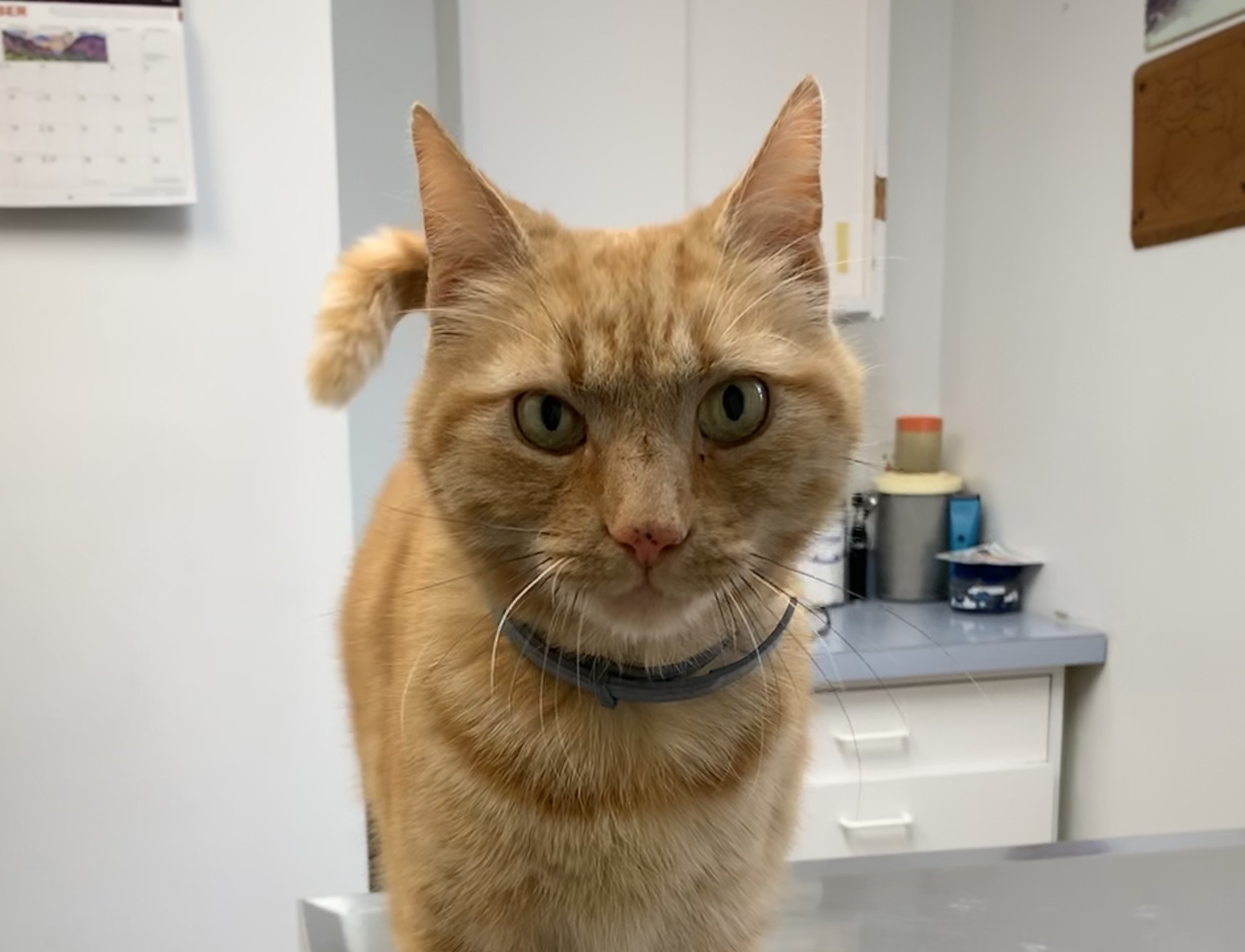 Found male orange tabby on West Road, Pleasant Valley on Wednesday 11/27. Very friendly with grey Seresto flea collar, no chip, no id.