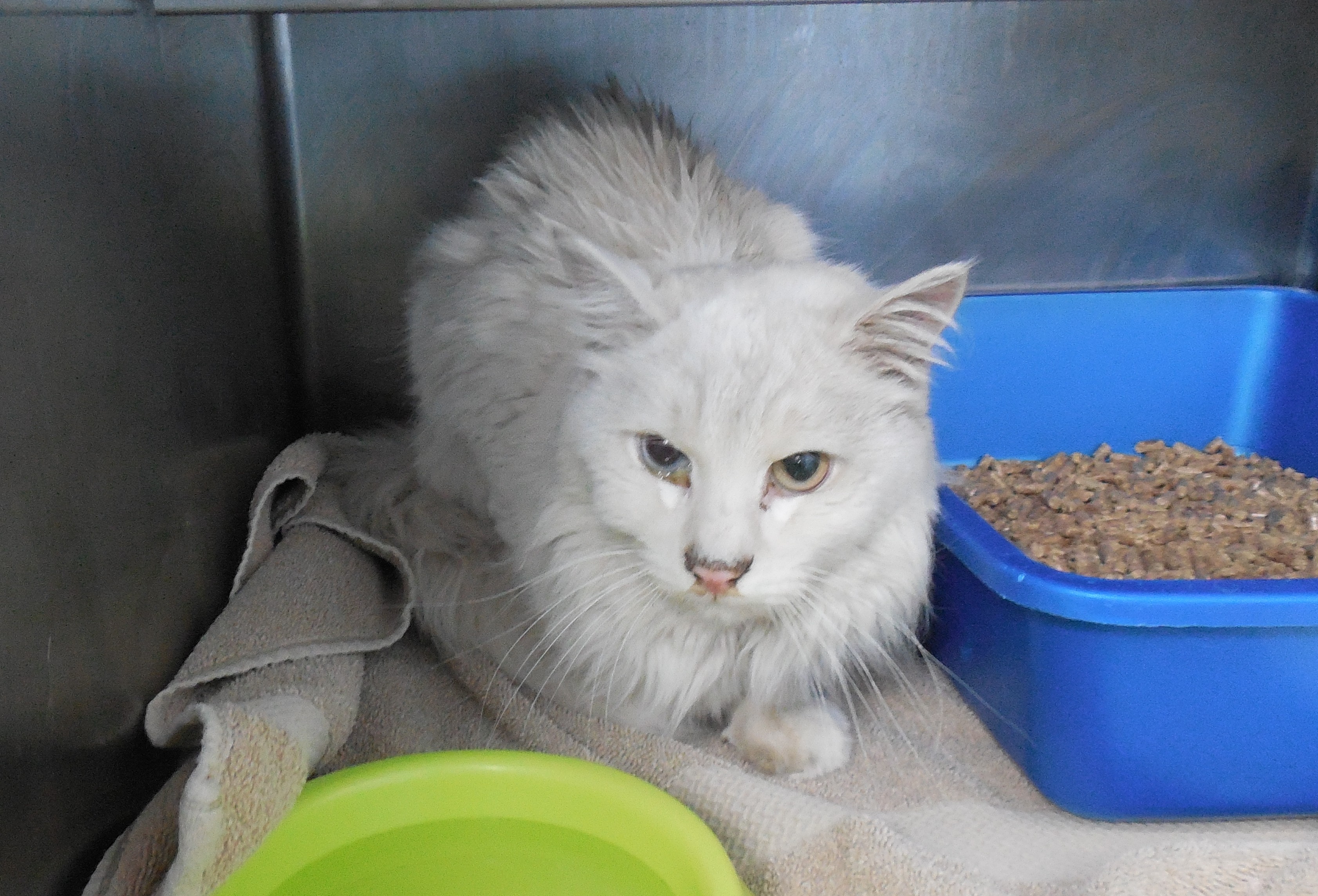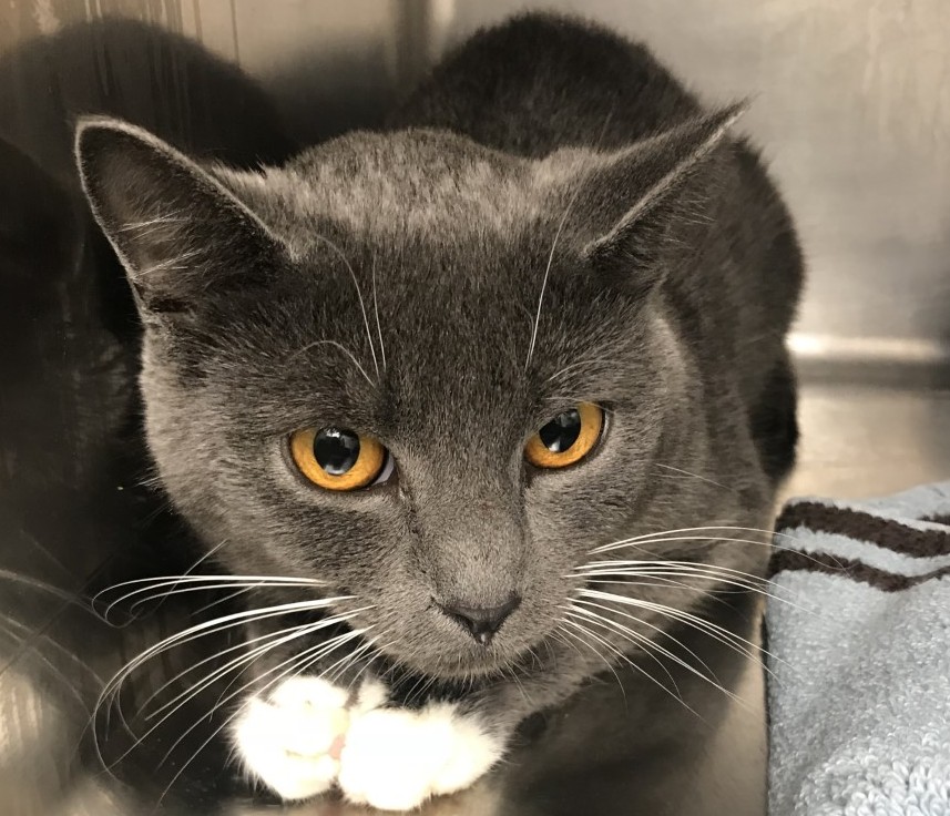 This cat was found in Poughkeepsie and brought to the DCSPCA. This cat is grey with white toes and amber colored eyes.