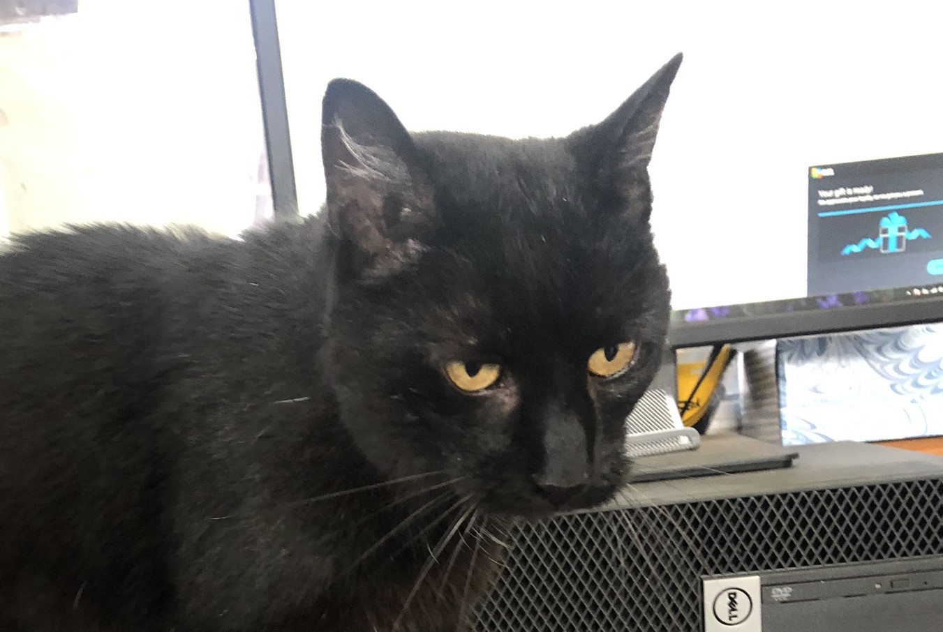 Black cat. I believe it’s a female? Wandered into the Town of Clinton Highway Dept.