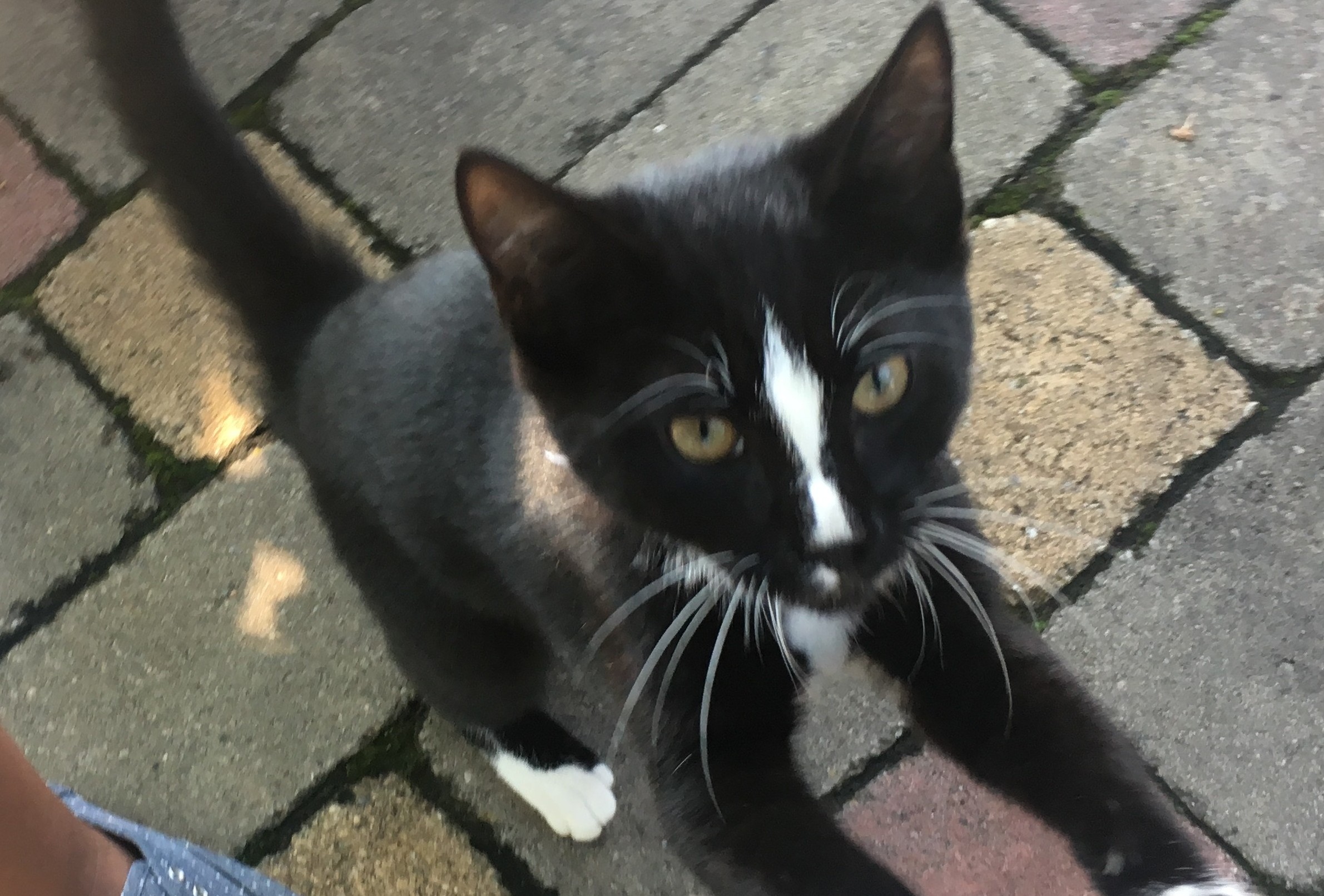 This Kitty has been hanging out at my parents' house on Beatie Rd and Rt 207 in Rock Tavern, NY, for the last couple of days. The cat is mostly black with white paws. The left front paw has a a small black spot. The ridge of his nose, neck and chest are white. There’s