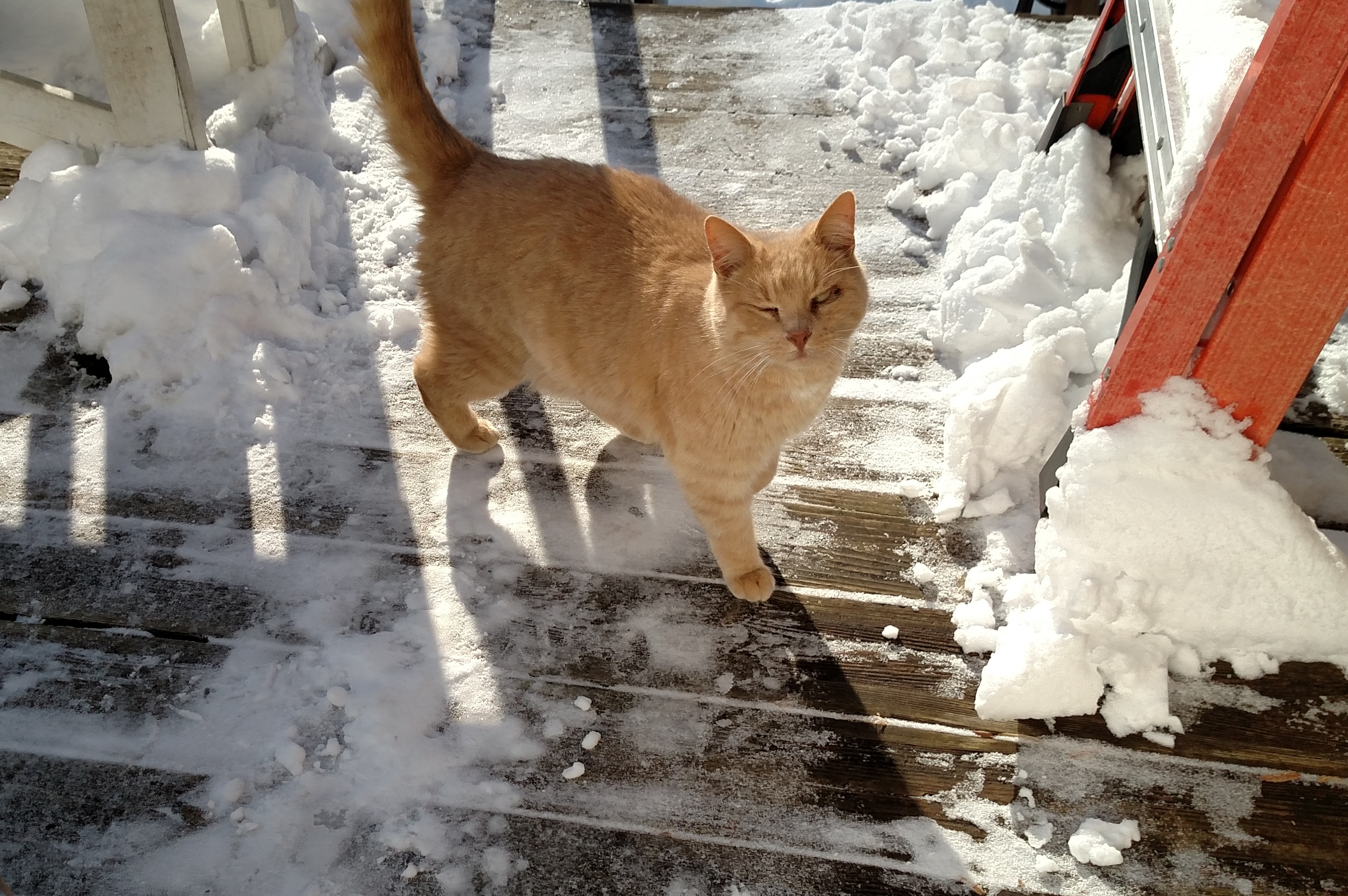 He showed up on my deck in mid-December. My son has been able to pet him a couple of times. He is really afraid - but he is getting better. He used to run off the deck when we fed him. Now he waits for me to put the food out.