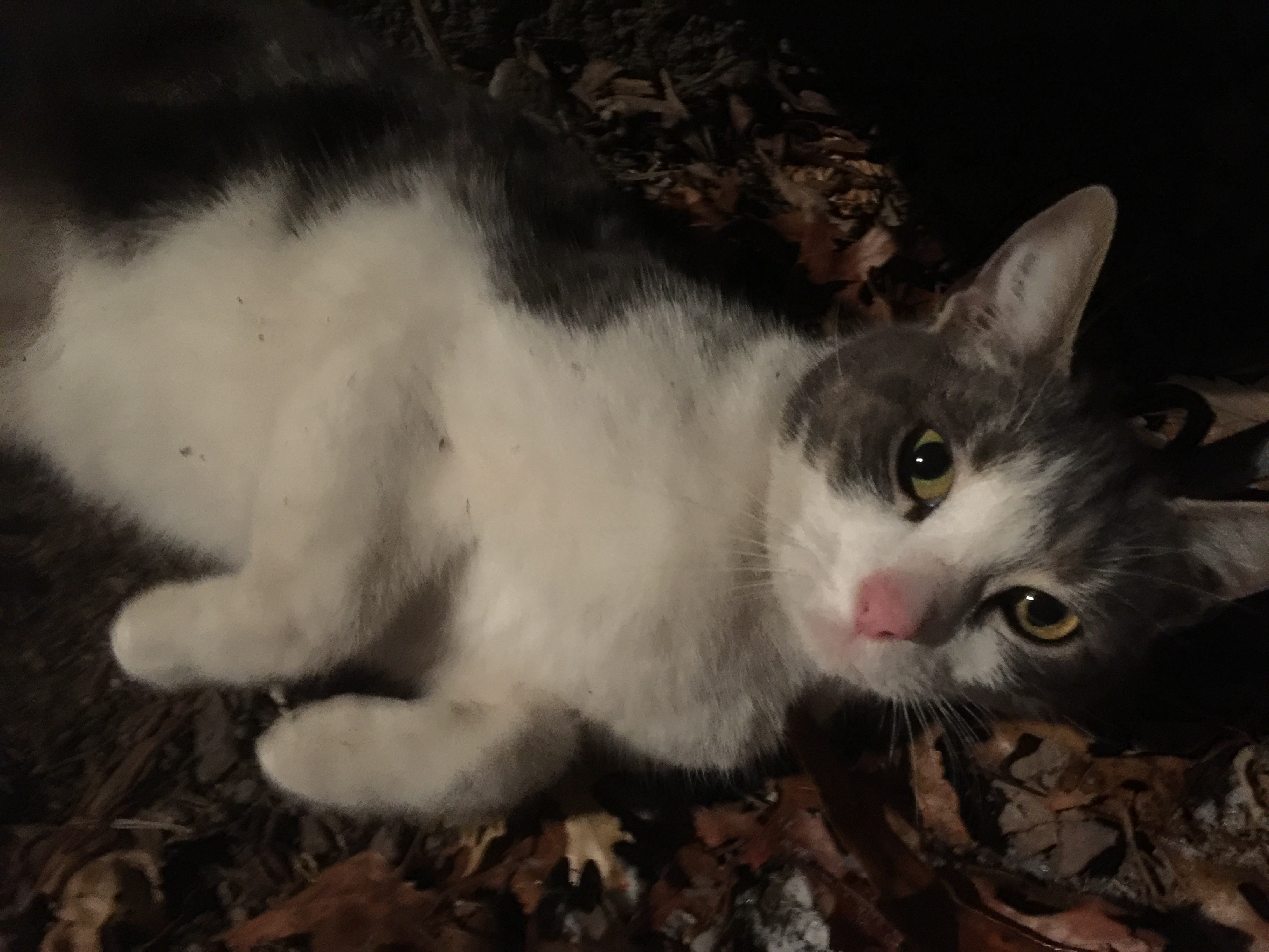 Found half frozen in the snowstorm; female; VERY sweet and affectionate; knows litterbox etiquette; no microchip. Keeping her warm and fed.
