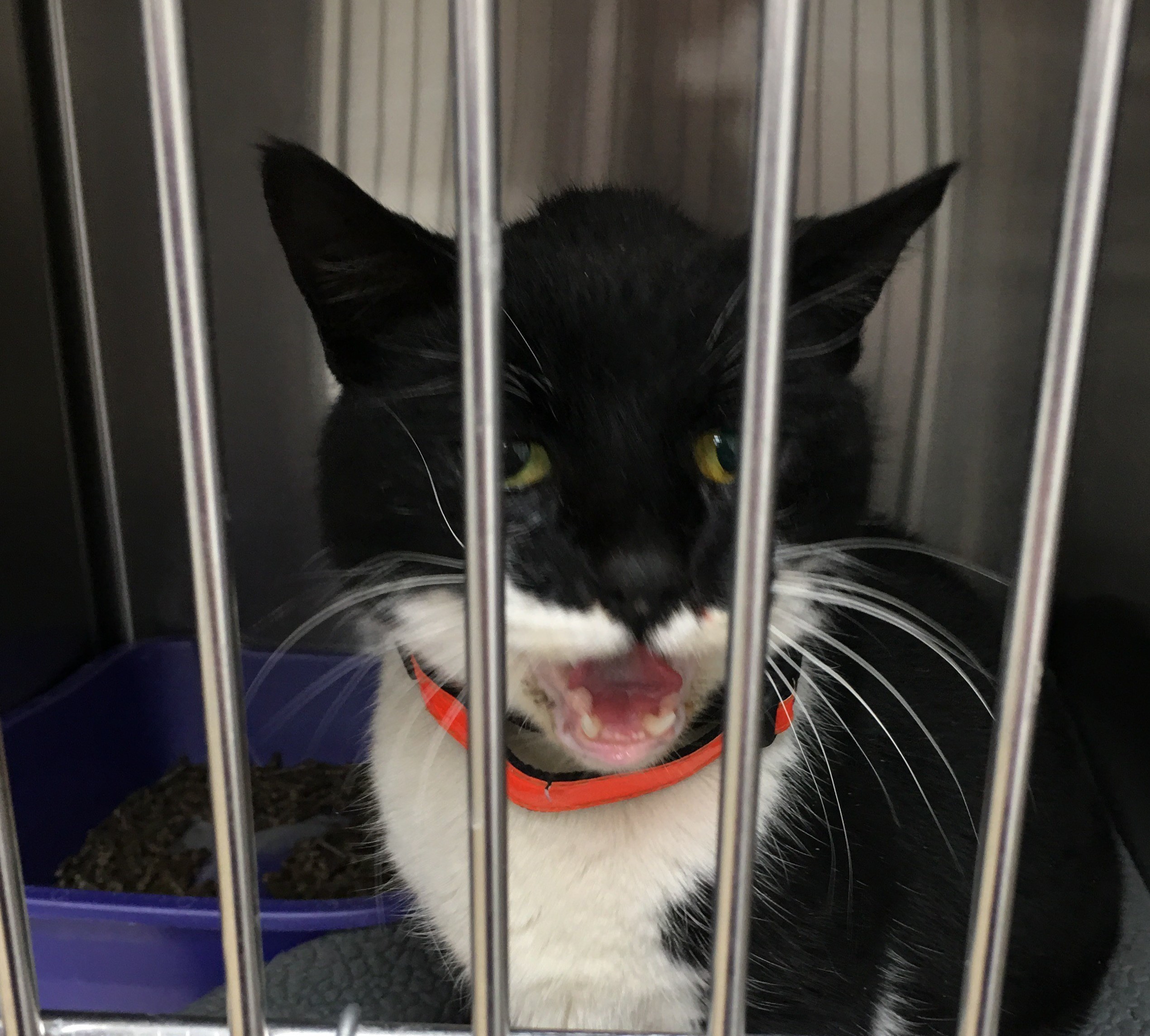 Neutered male, wearing an orange collar. Very friendly. Needs his family.
