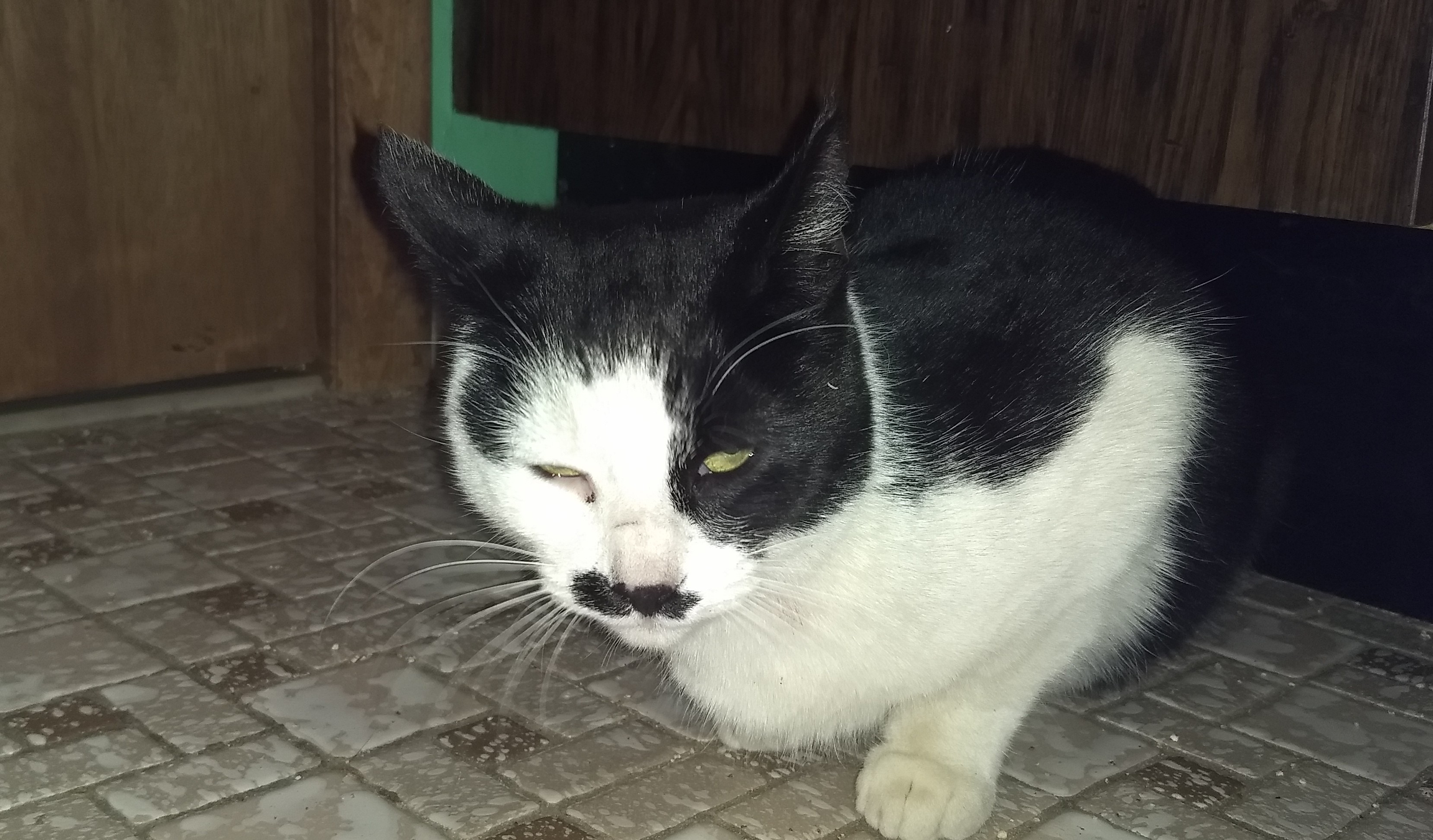 Cat came to our house two nights in a row. Seems to be in good health, but very, very hungry. Black and White with a black mustache. No collar. Will take to our vet in morning to check for chip.