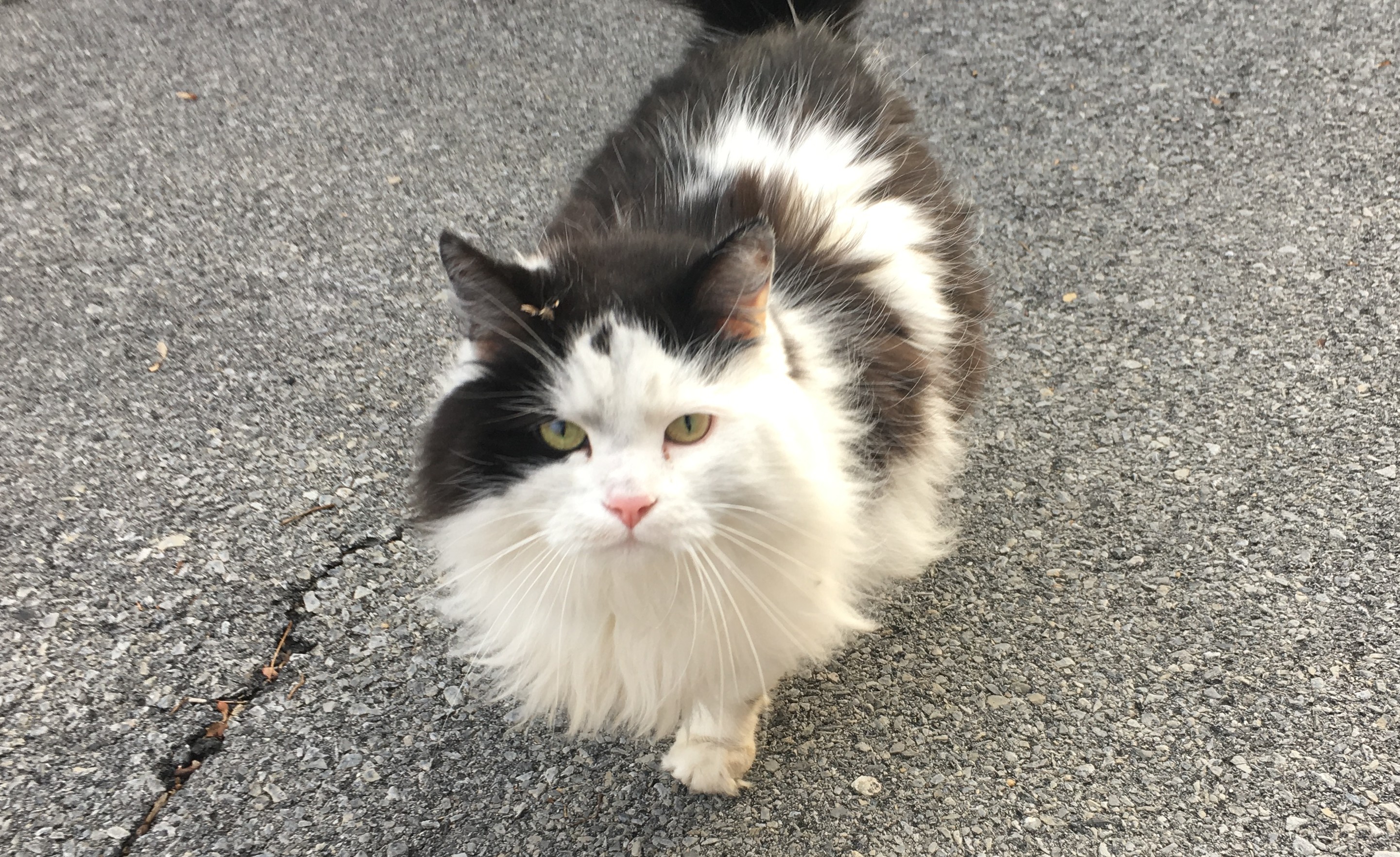 Black and white long-haired cat found in Blooming Grove. There is no collar and it looks like the cat has been living outside for a while, but it is very friendly and affectionate.
