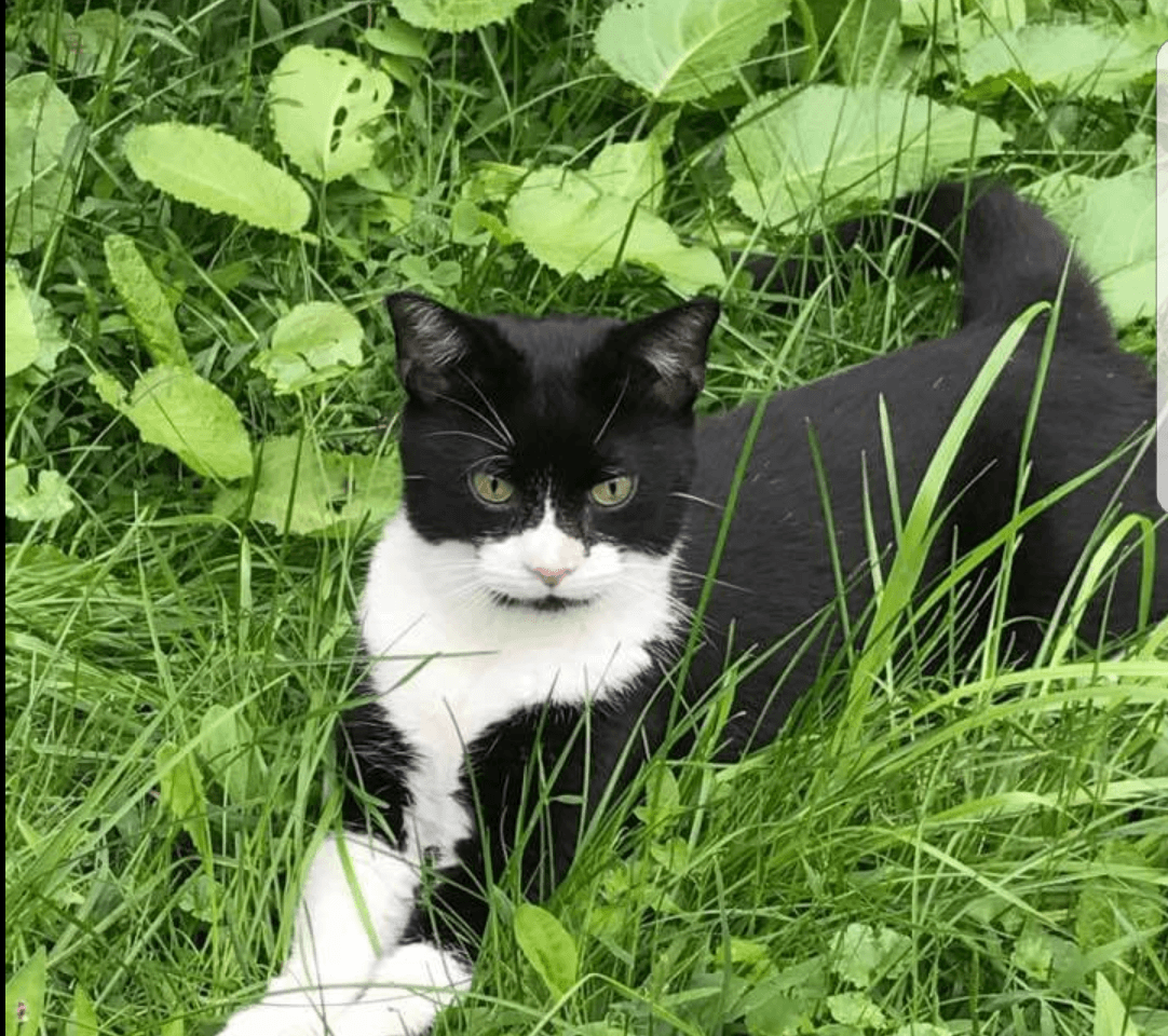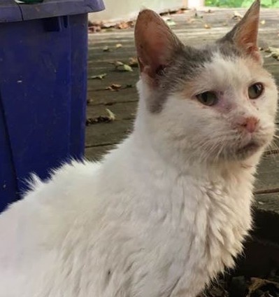 This elderly, very friendly, female kitty showed up emaciated at my mother in laws down the road. Very hungry, super friendly and affectionate, she has to belong to someone with how social she is. Dental issues, dehydrated, and either shaved or skin issues.