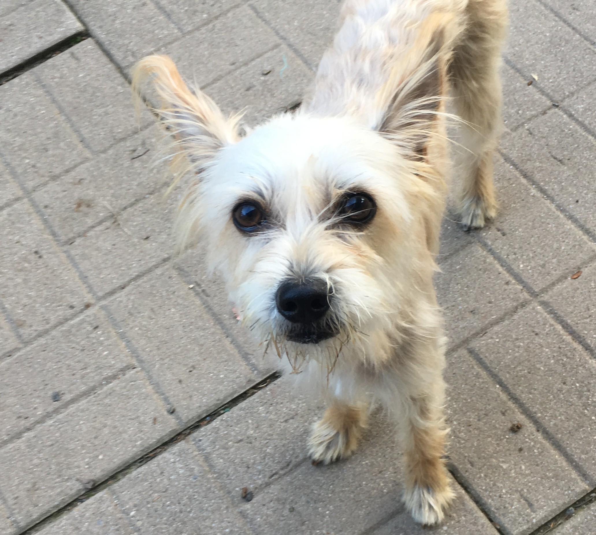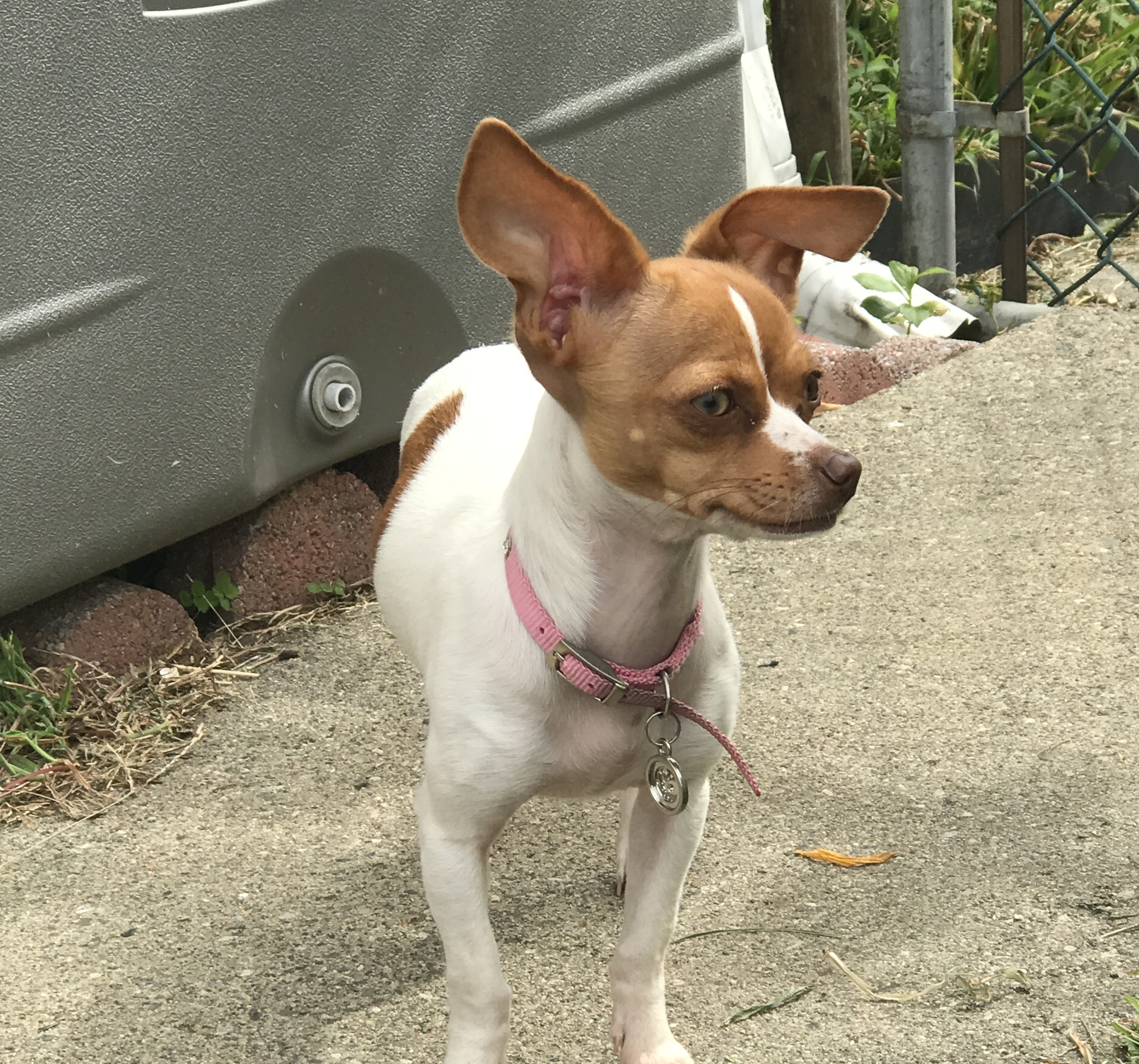I found a chihuahua on Broadway in Verplanck this morning. She is mostly white with brown ears and face. She's wearing a pink collar with jewels on it.