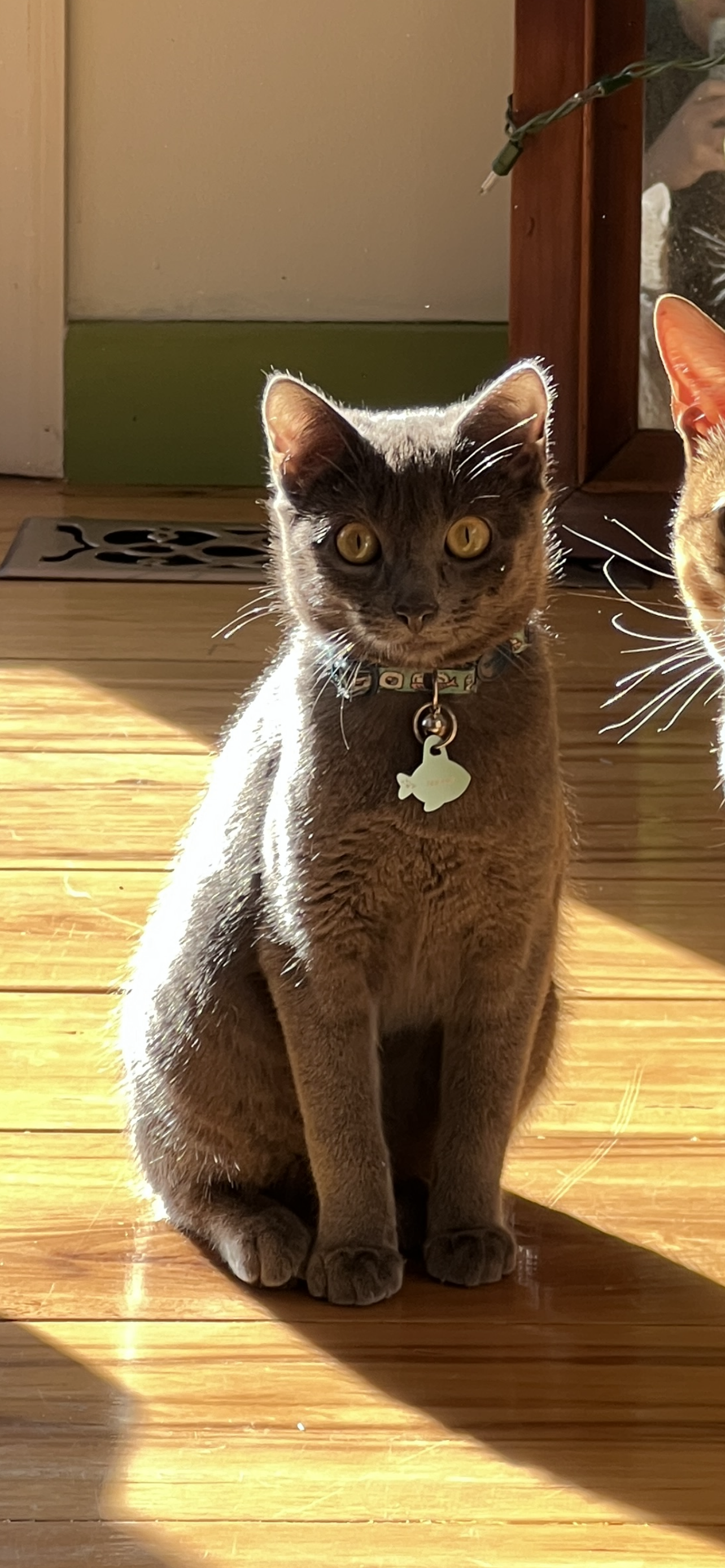 Grey kitten, small white patch on her chest. Not spayed. 7 months old.