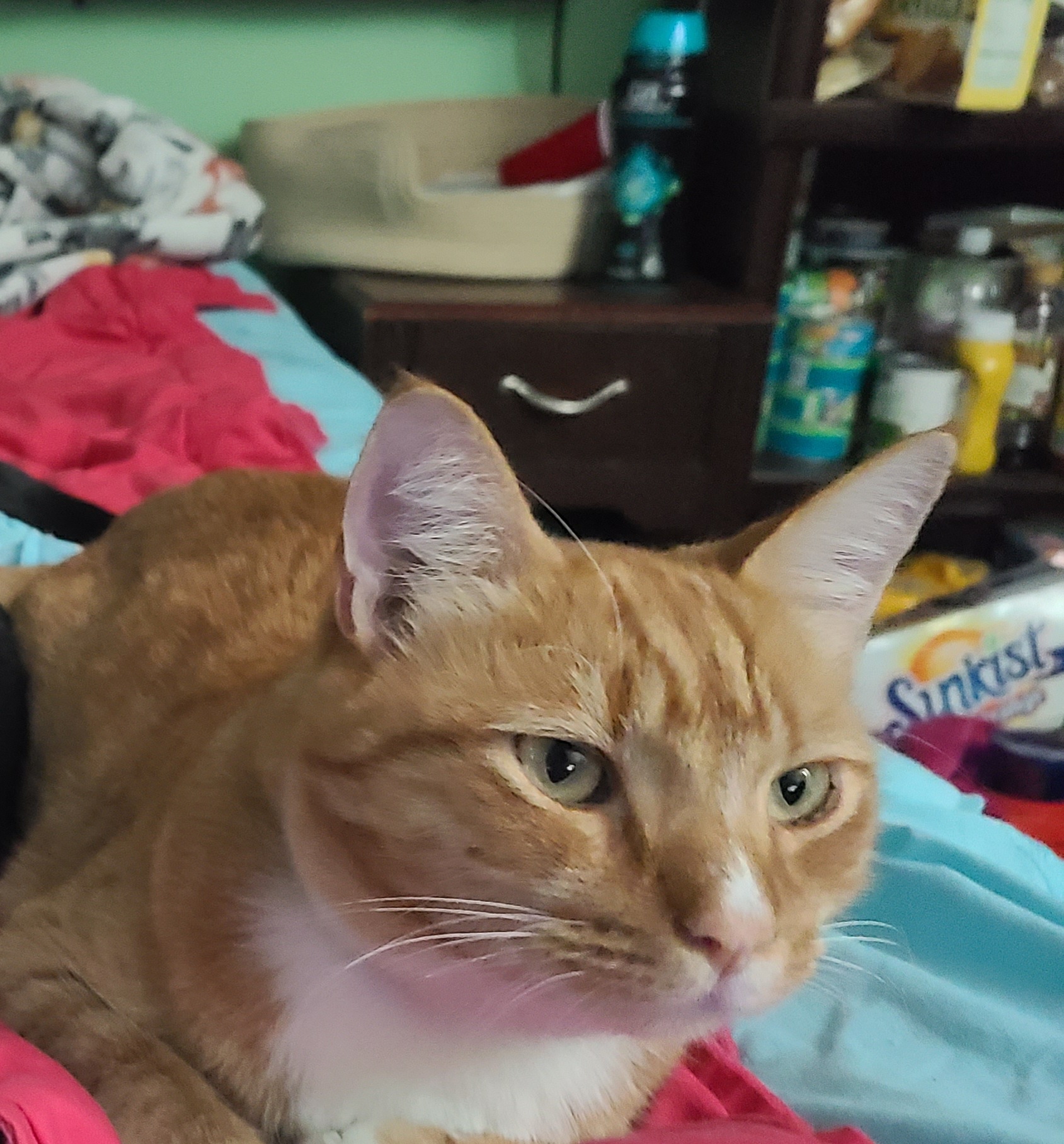 Orange Tabby, white chest and paws, splash of white on nose, very friendly and purrs like an engine.