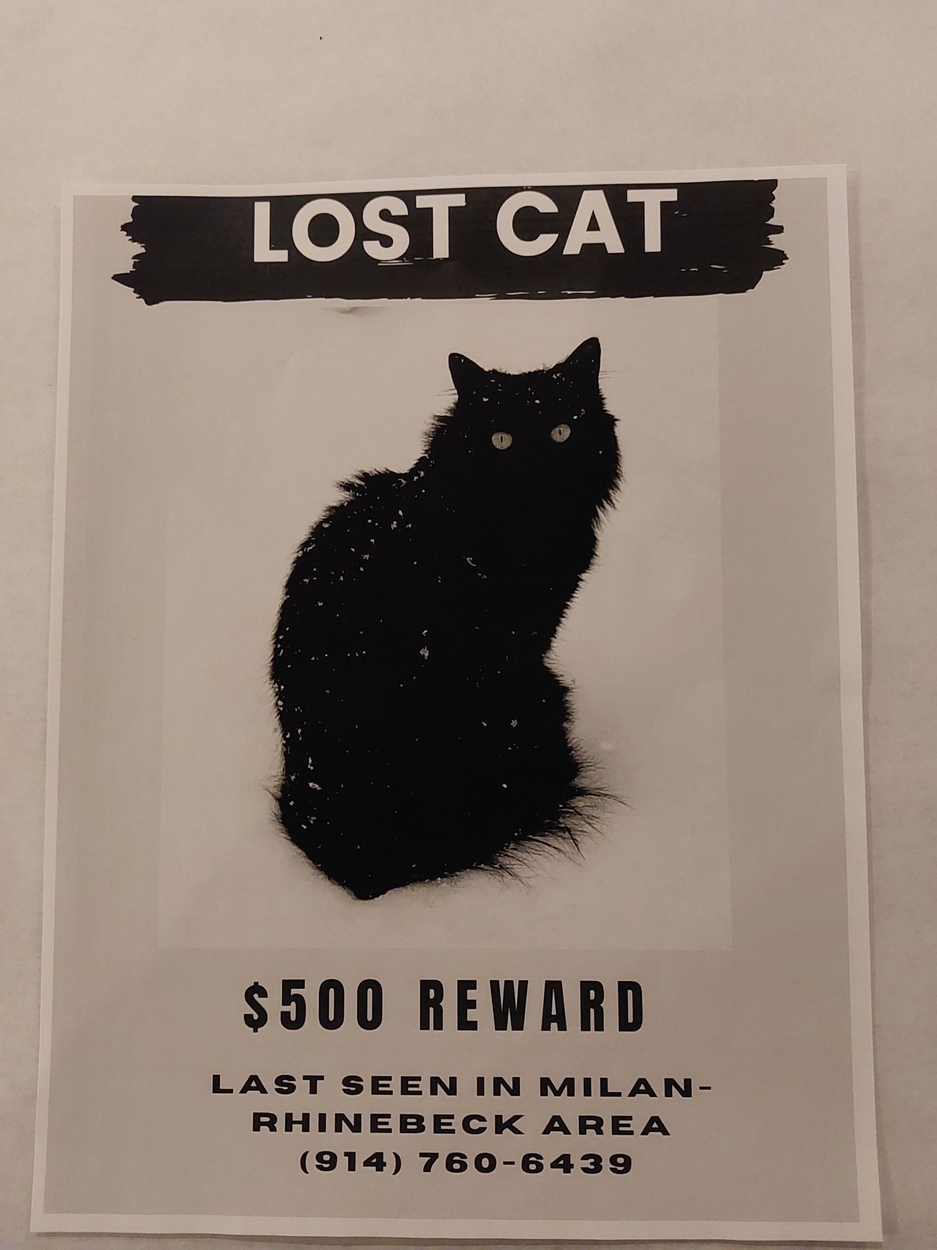 My cay is lost in the Milan, Rhinebeck area. She is long haired black female and very skiddish.